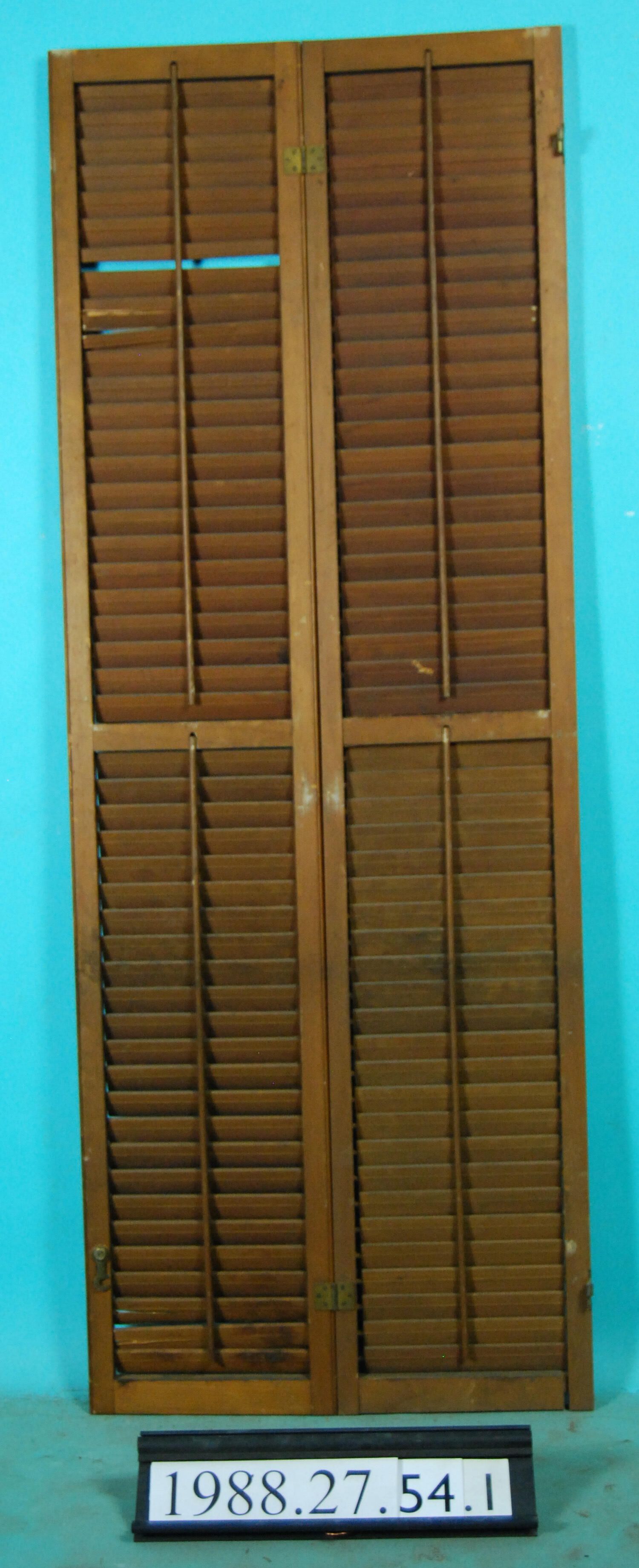 One pair of interior louvered shutter leaves joined with hinges. Finish: Varnished Material: Wood