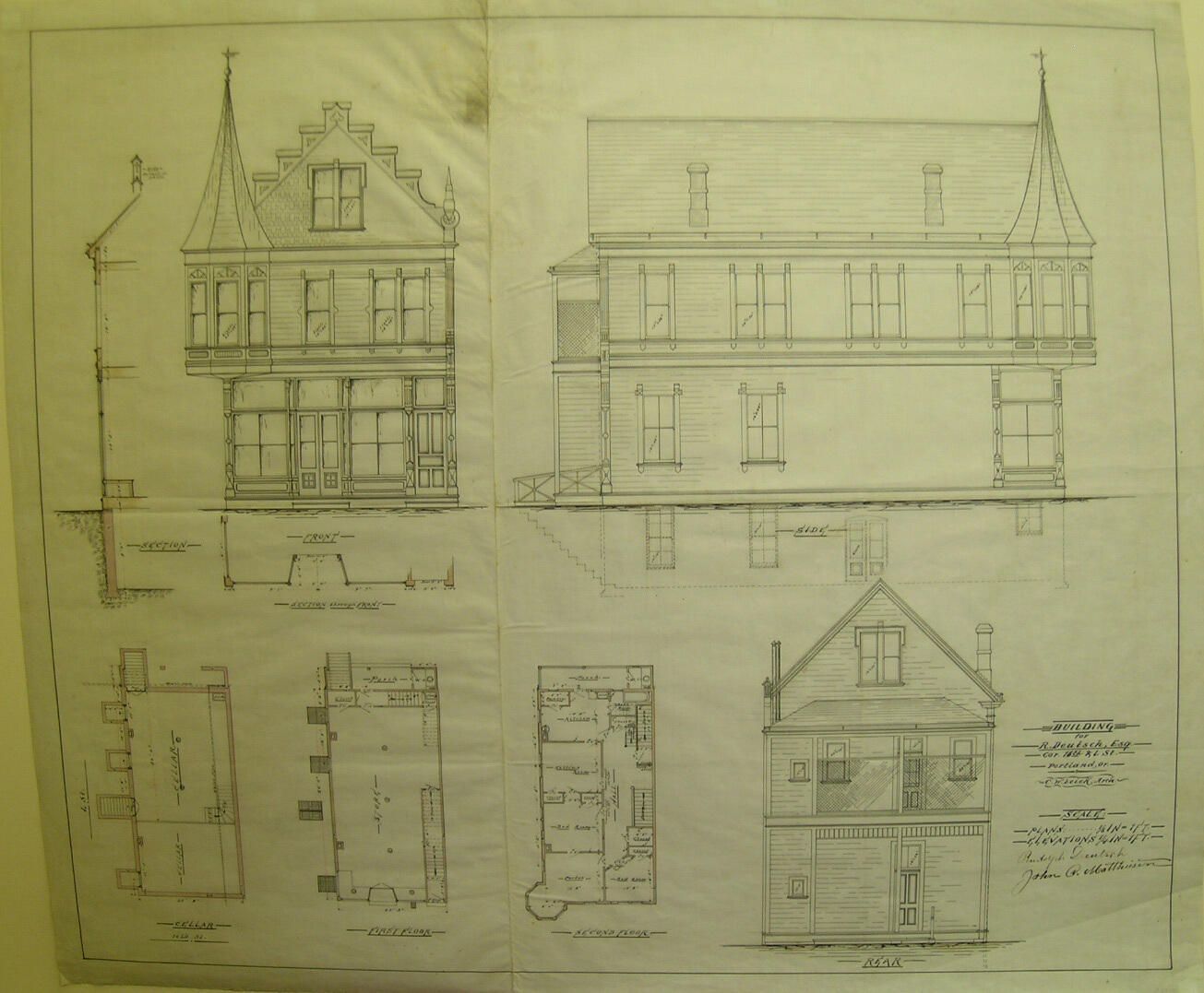 List of Drawings in set: cellar plan, 1st floor plan, 2nd floor plan, front elevation, side elevation, rear elevation, partial section.Lexicon