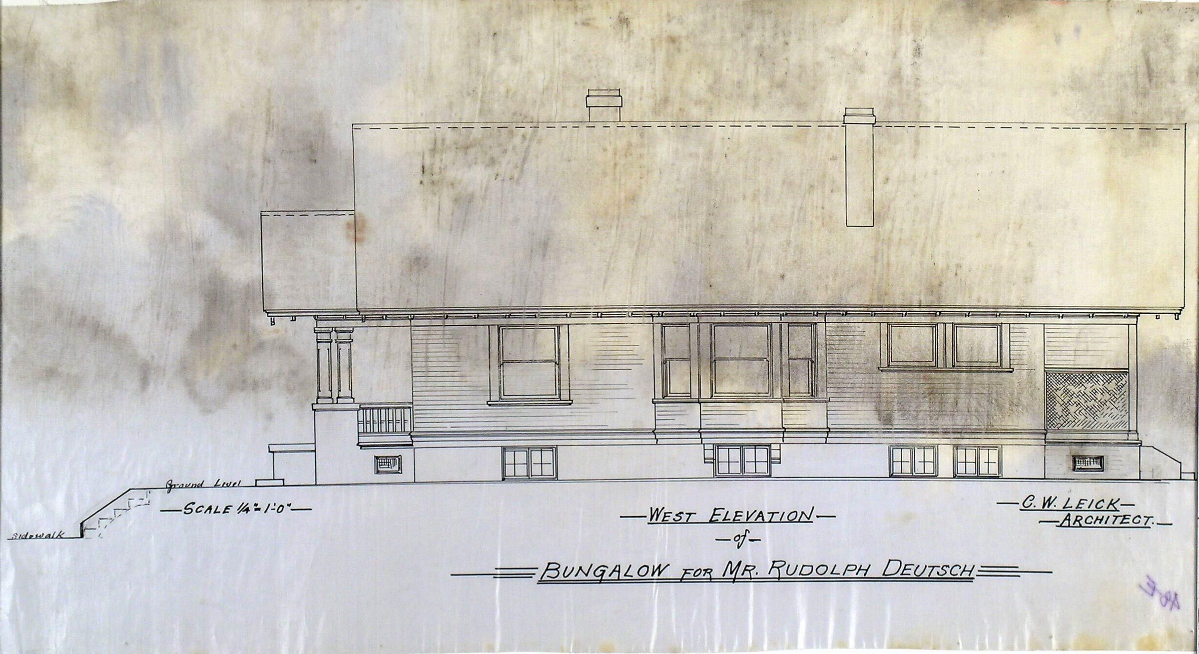 Building Name: Bungalow for Mr. Rudolph Deutsch Architect: C.W. Leick Building Location: unknown Still Existing?: unknown Building Description: bungalow List of Drawings in set: west elevation