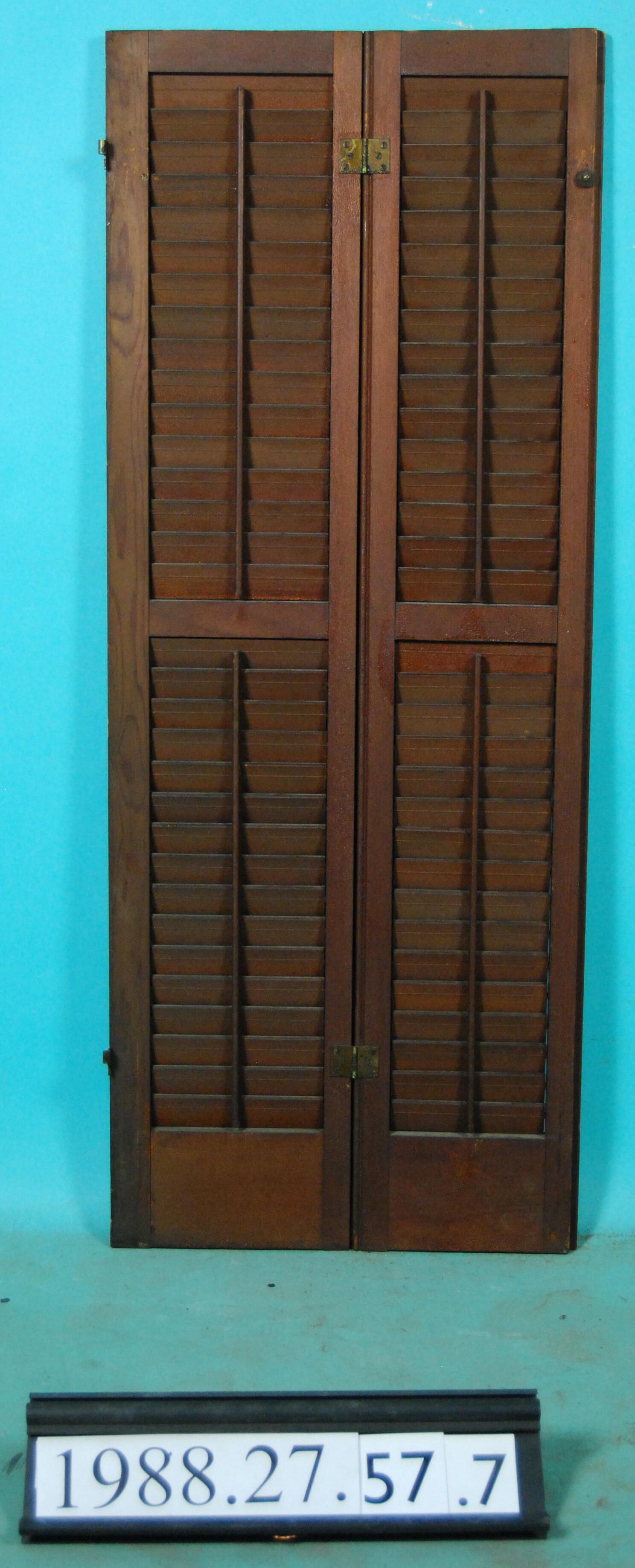 One pair of interior louvered shutter leaves joined with hinges. Finish: Varnished Material: Wood