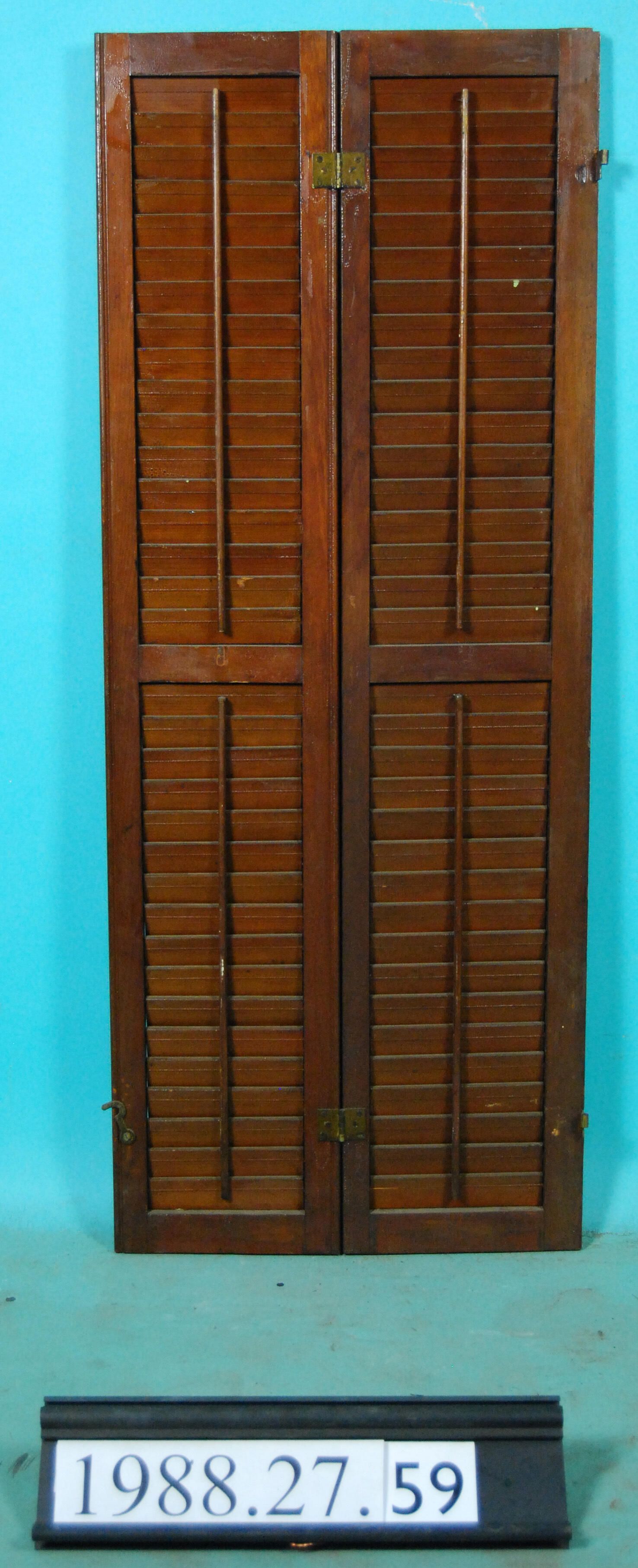One pair of interior louvered shutter leaves joined with hinges . Finish: Varnished Material: Wood