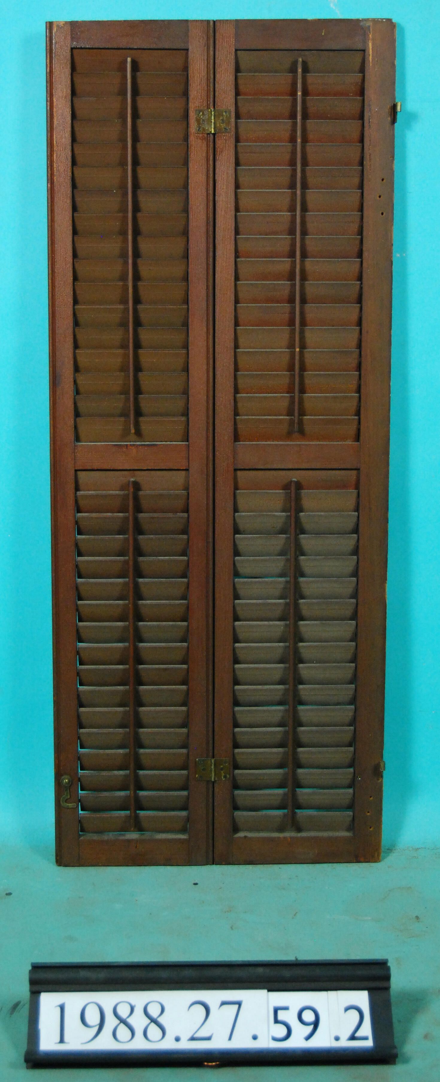 One pair of interior louvered shutter leaves joined with hinges . Finish: Varnished Material: Wood