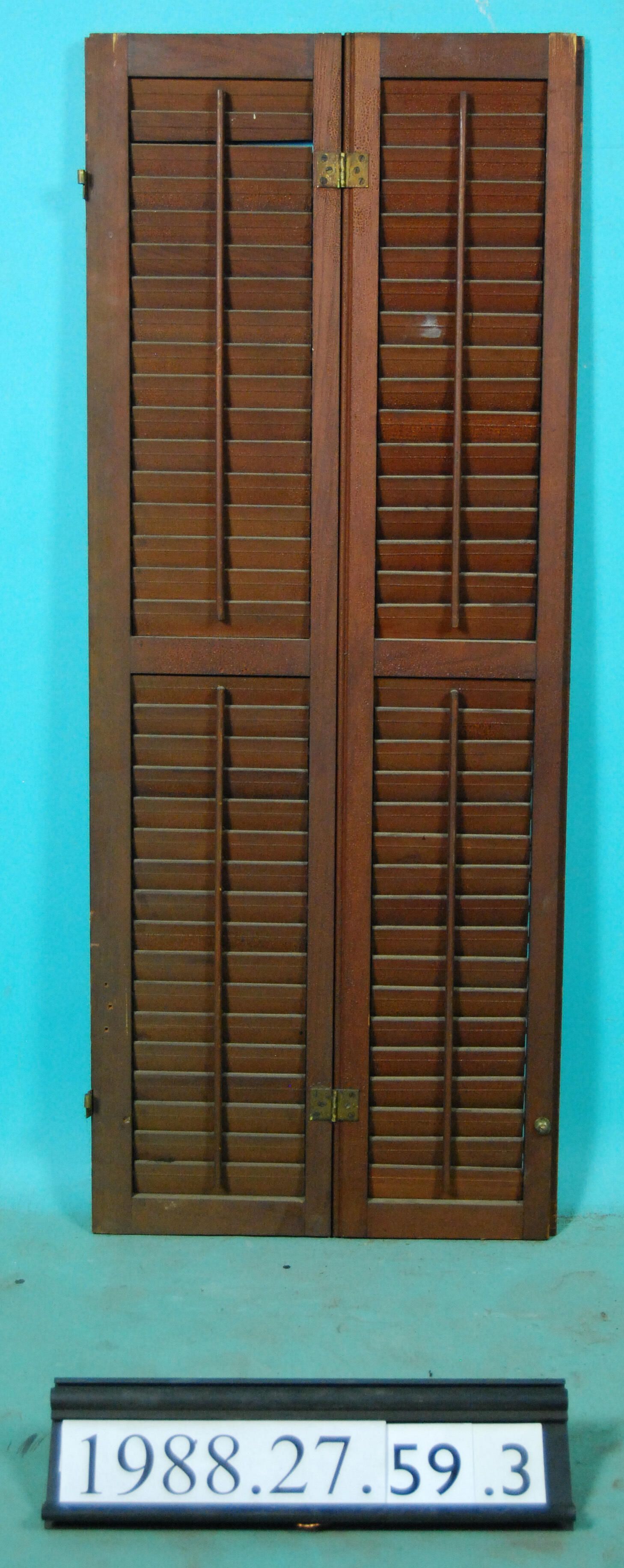 One pair of interior louvered shutter leaves joined with hinges . Finish: Varnished Material: Wood