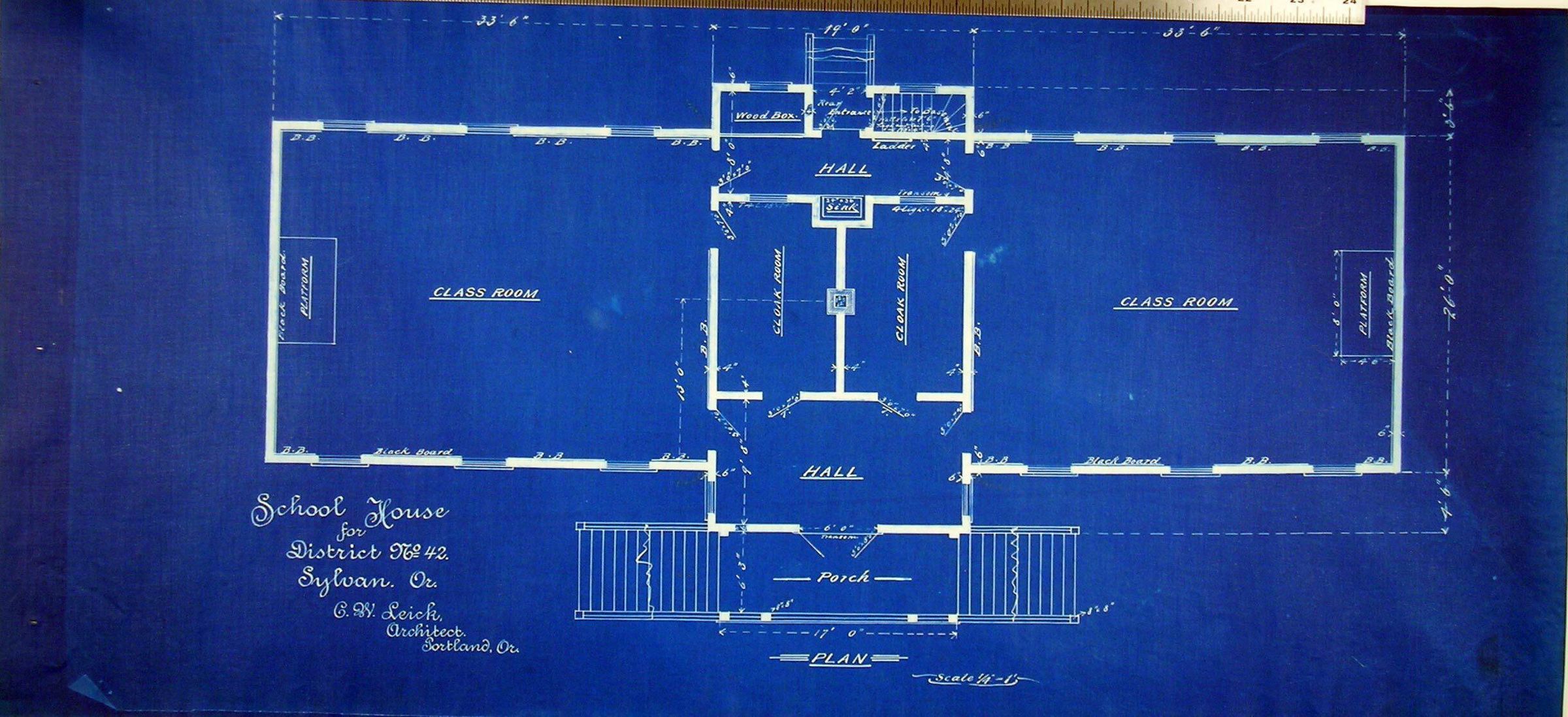 Building Name: School house for District #42 Architect: C.W. Leick Building Location: Sylvan, OR Still Existing?: unknown Building Description: victiorian schoolhouse with bell steeple List of Drawings in set: first floor plan, blueprint