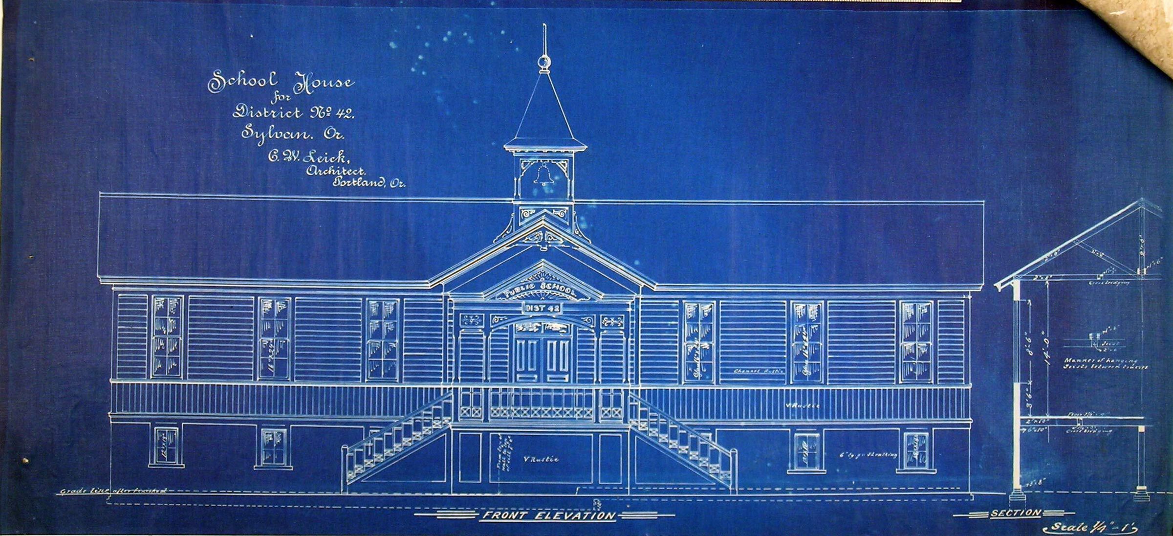 Building Name: School house for District #42 Architect: C.W. Leick Building Location: Sylvan, OR Still Existing?: unknown Building Description: victiorian schoolhouse with bell steeple List of Drawings in set: front elevation and section, blueprint