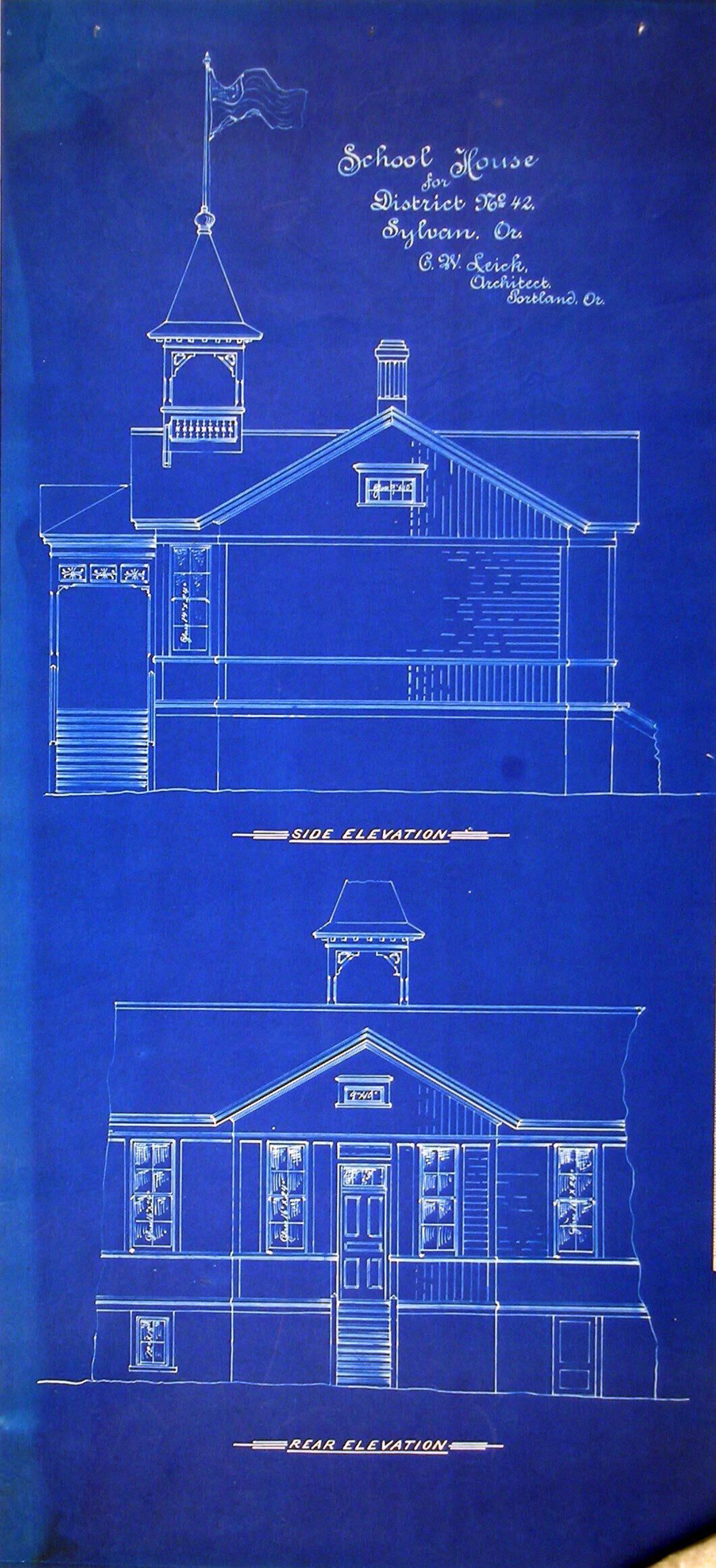 Building Name: School house for District #42 Architect: C.W. Leick Building Location: Sylvan, OR Still Existing?: unknown Building Description: victiorian schoolhouse with bell steeple List of Drawings in set:side and rear elevations, blueprint