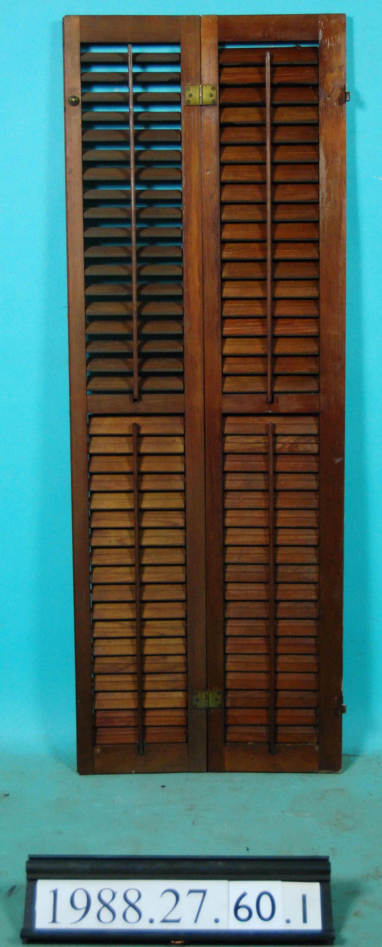 One pair of interior louvered shutter leaves joined with hinges. Finish: Varnished Material: Wood