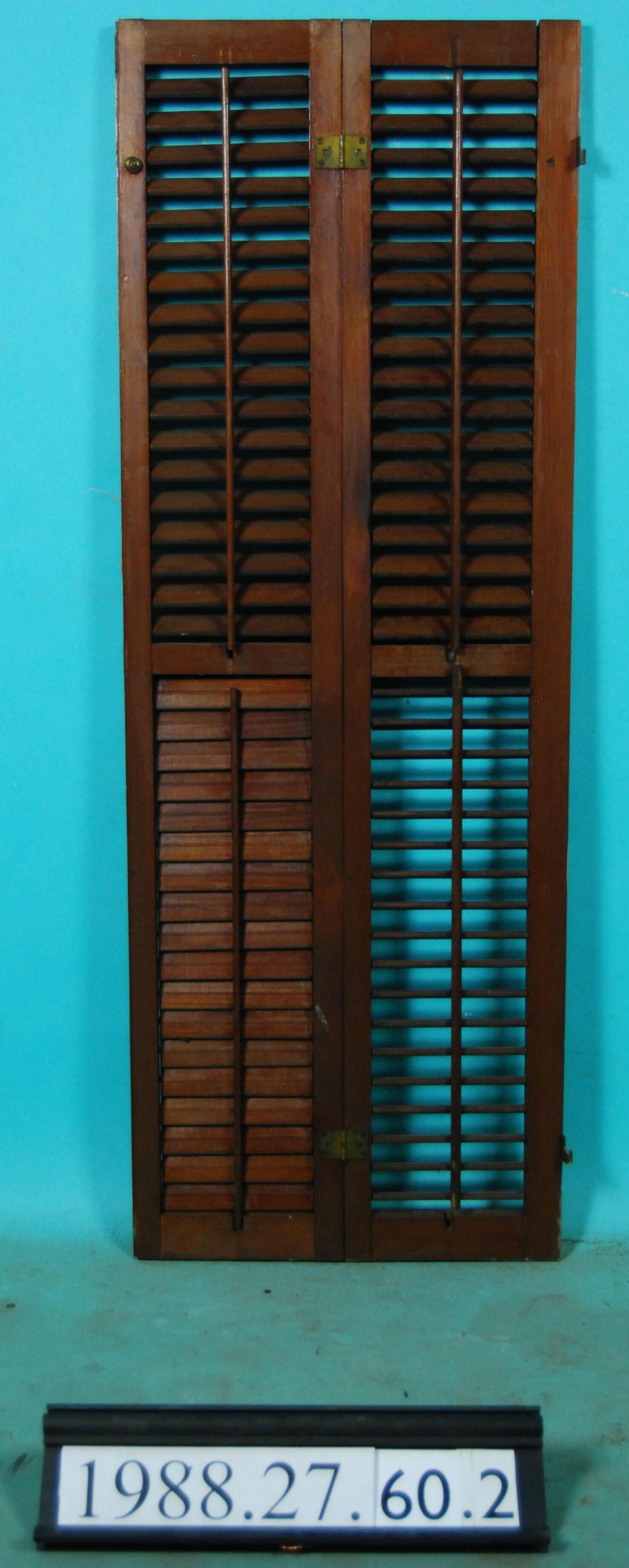One pair of interior louvered shutter leaves joined with hinges. Finish: Varnished Material: Wood