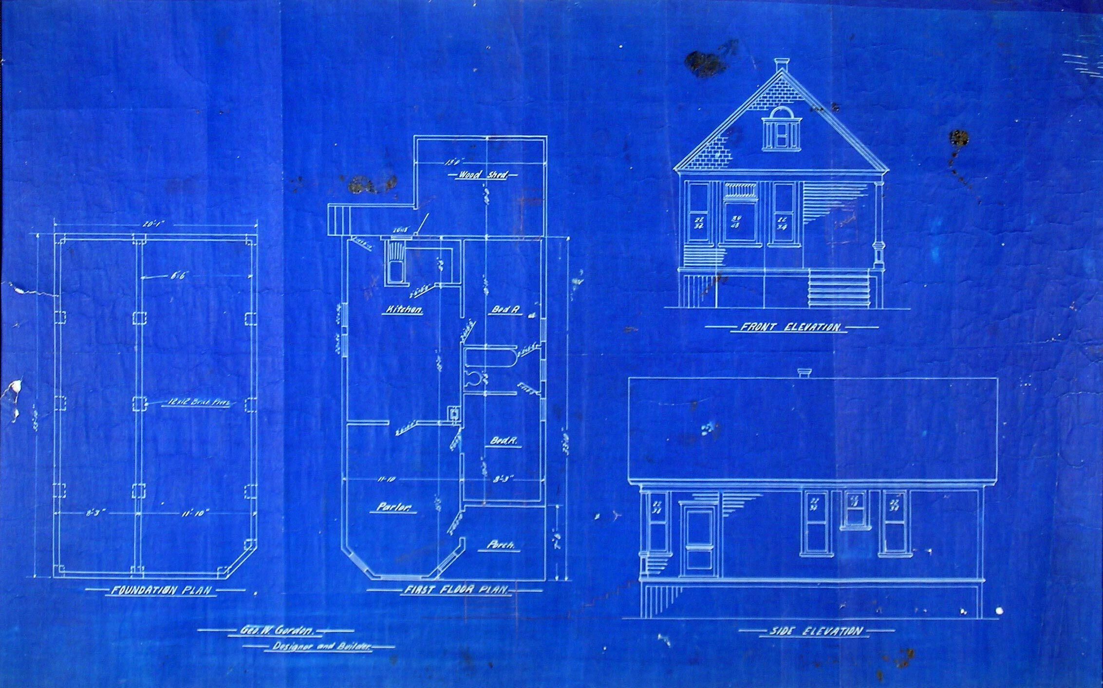 List of Drawings in set: foundation plan, 1st floor plan, front elevation, side elevation - all on single sheetLexicon