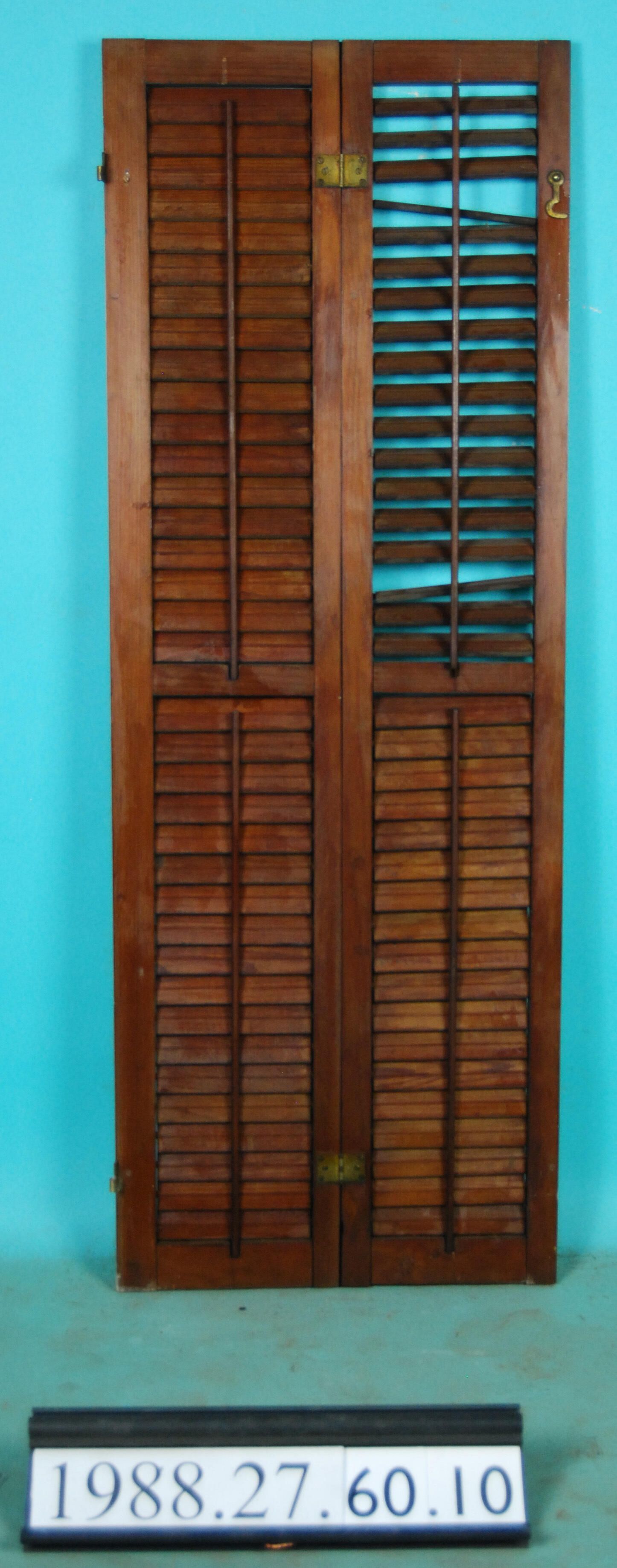 One pair of interior louvered shutter leaves joined with hinges. Finish: Varnished Material: Wood