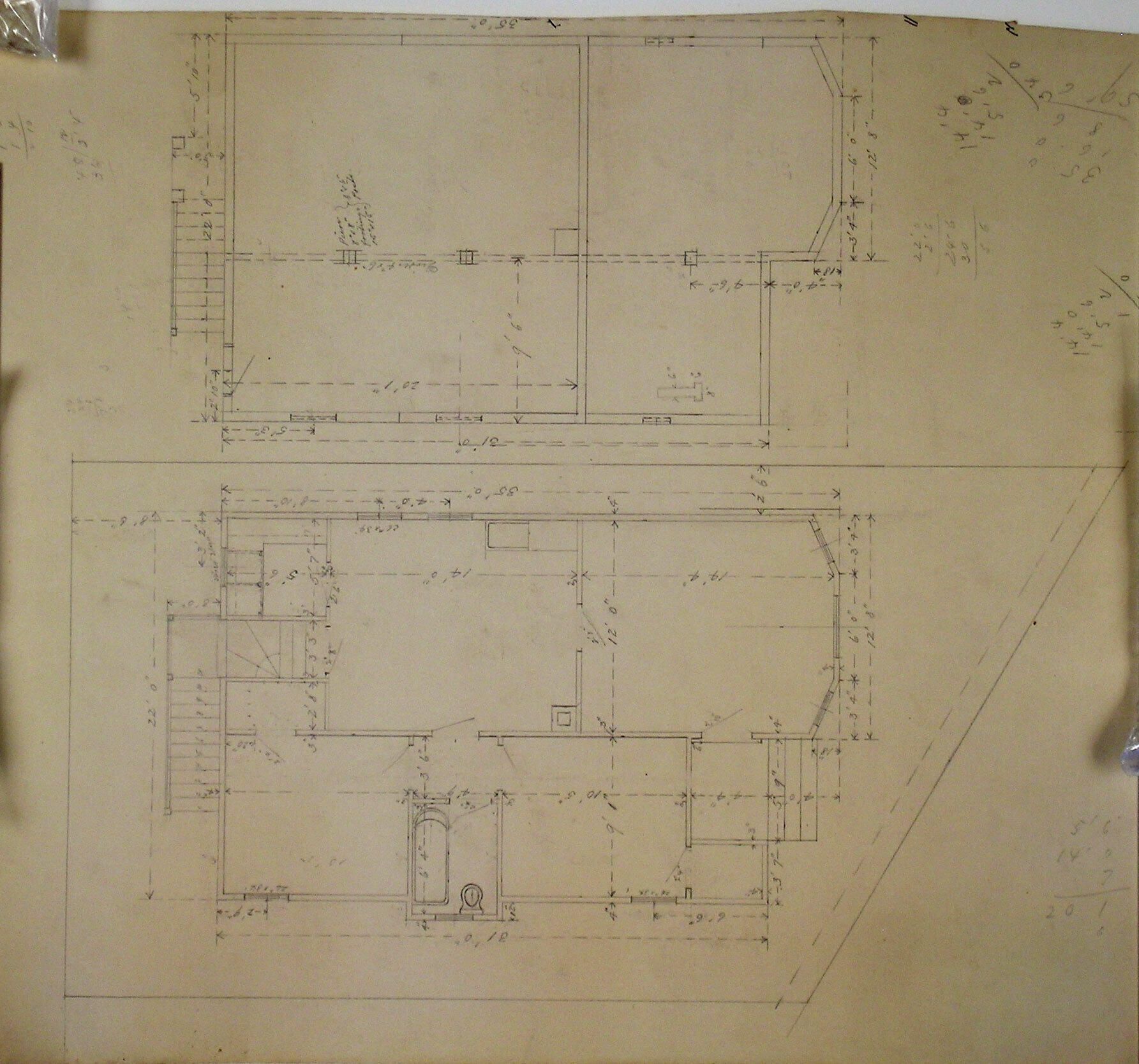 List of Drawings in set: preliminary first floor plans and foundation plans