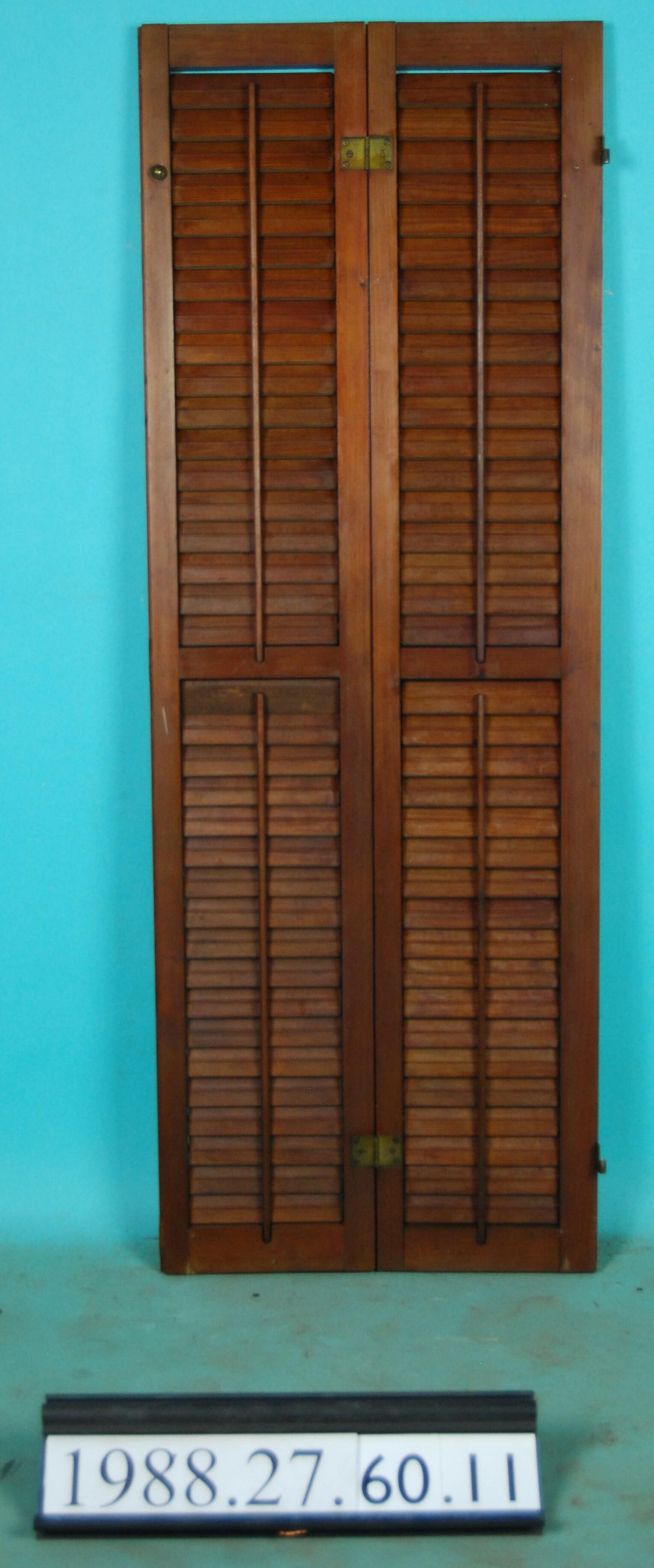 One pair of interior louvered shutter leaves joined with hinges. Finish: Varnished Material: Wood