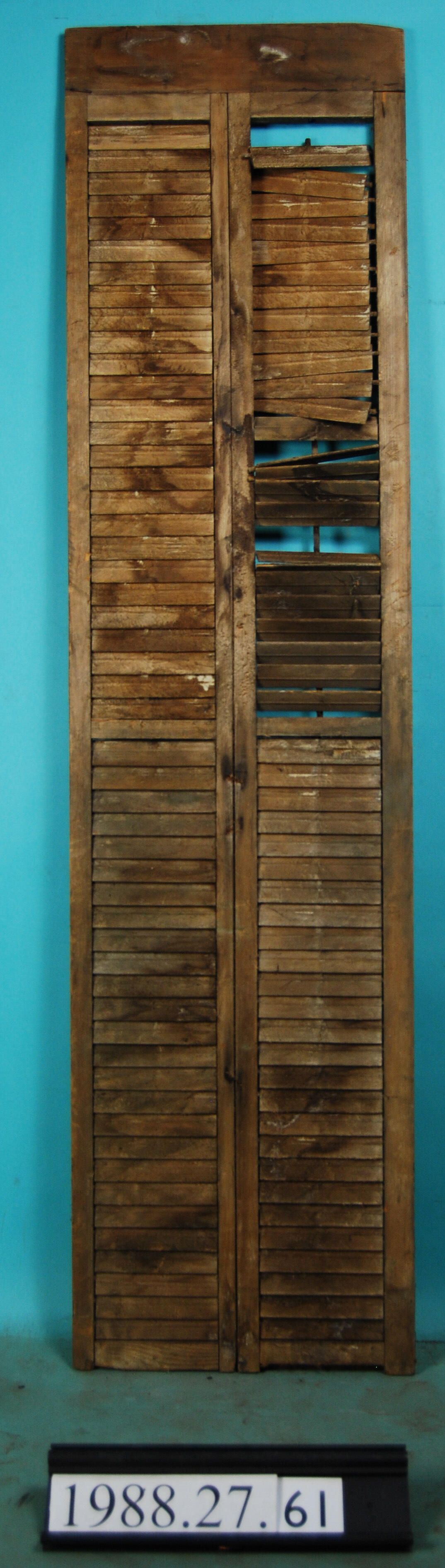 One pair of interior louvered shutter leaves joined with hinges, later modified with addition of board. Many louvers missing. Stripped of finish.