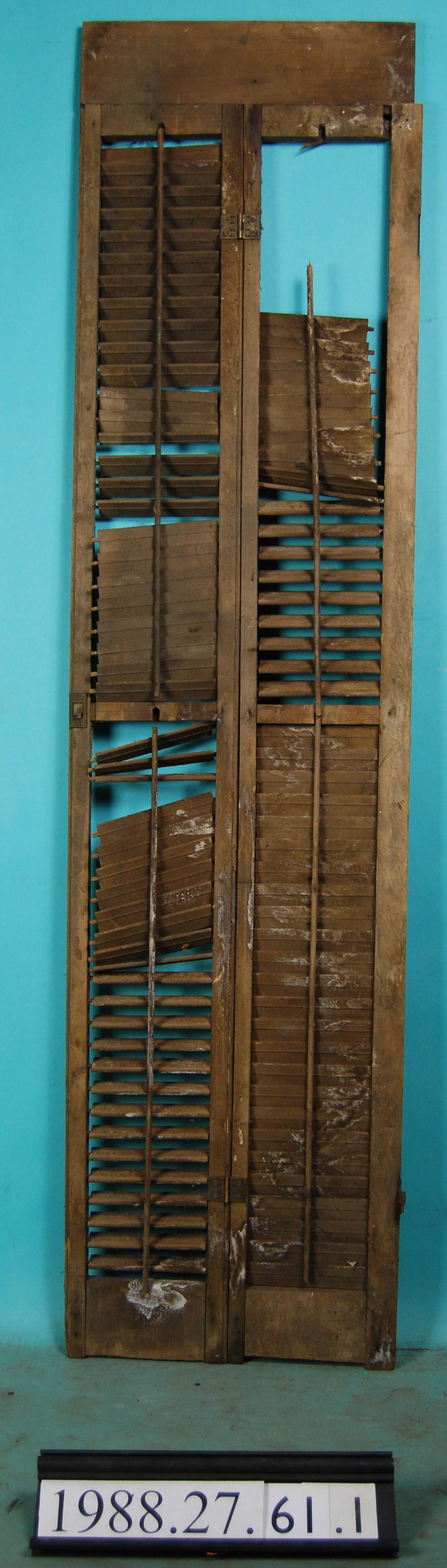 One pair of interior louvered shutter leaves joined with hinges, later modified with addition of board. Many louvers missing. Stripped of finish.