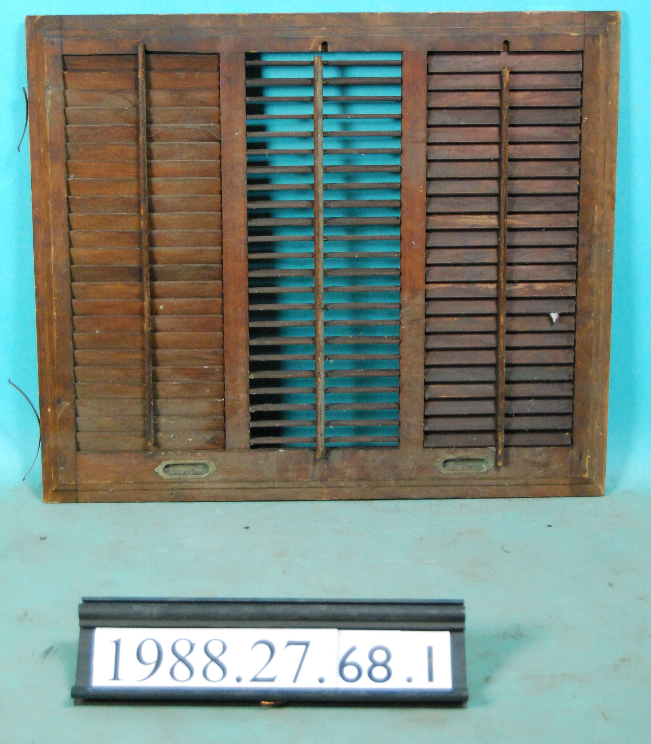 Single interior louvered shutter/blind designed to slide vertically within window frame,varnished. Has two recessed lift handles with impressed mark : "made by Edw. Hindes &Co. SanFrancisco"