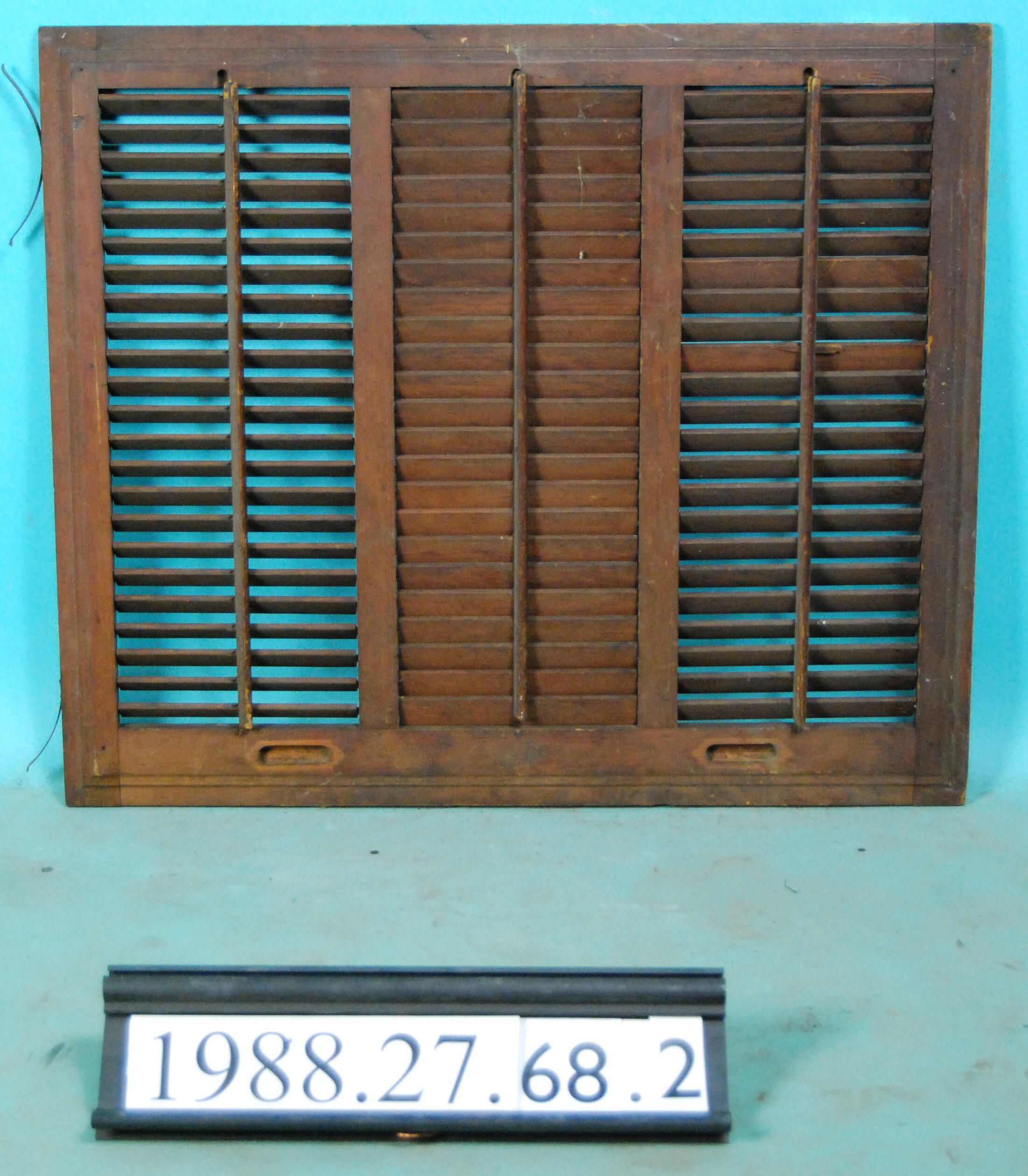 Single interior louvered shutter/blind designed to slide vertically within window frame,varnished. recessed lift handles are missing. Material: Wood
