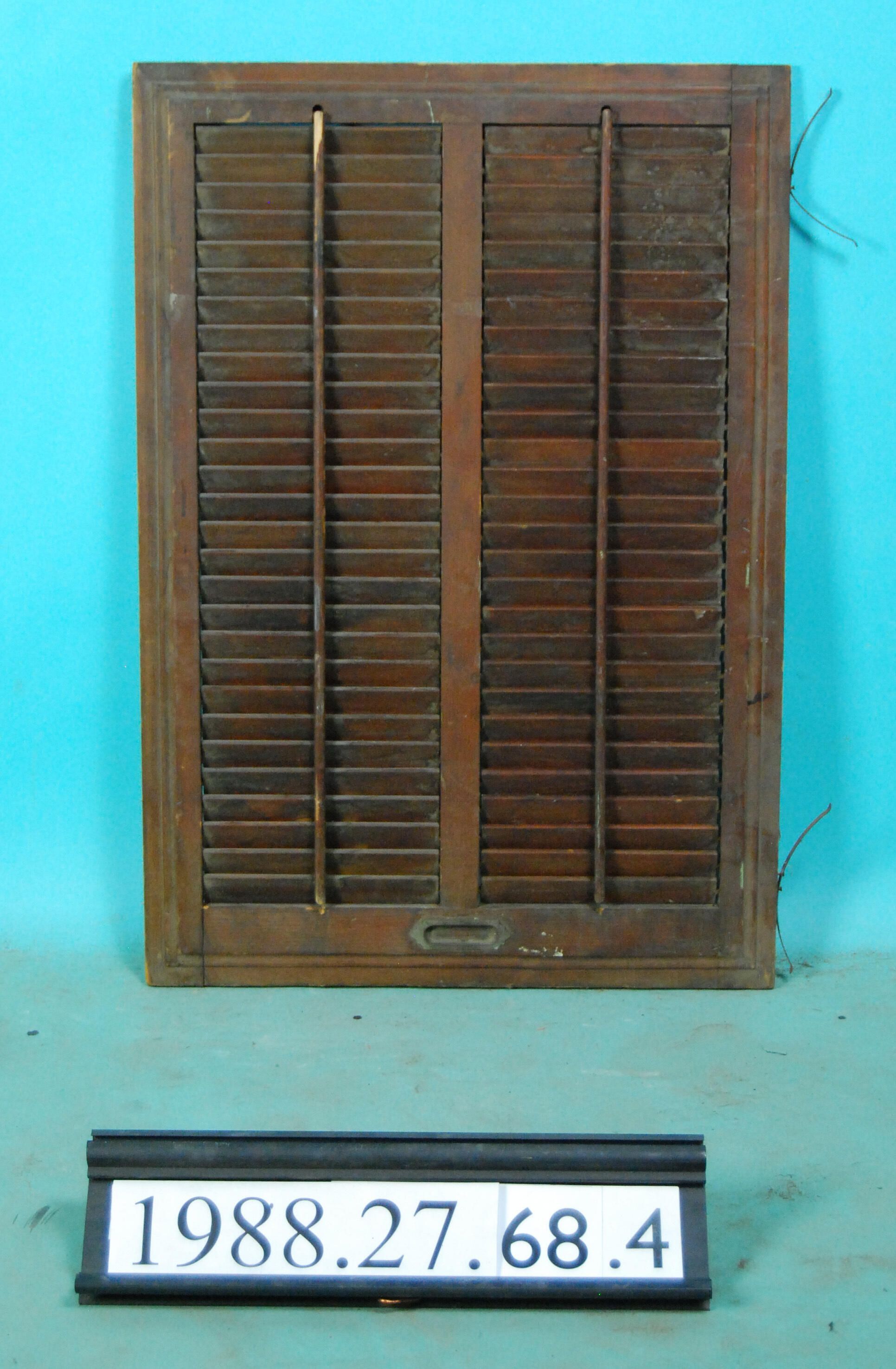 Single interior louvered shutter/blind designed to slide vertically within window frame,varnished. Has single recessed lift handle. Material: Wood