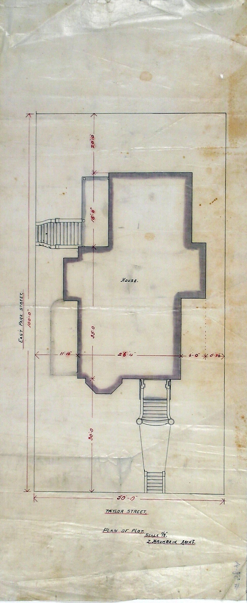 Building Name: Victorian Residence Architect: J. Krumbein Building Location: E. Park & Taylor St., Portland, OR Still Existing?: unknown Building Description: italianate victorian residence List of Drawings in set: plot plan, ink on linen