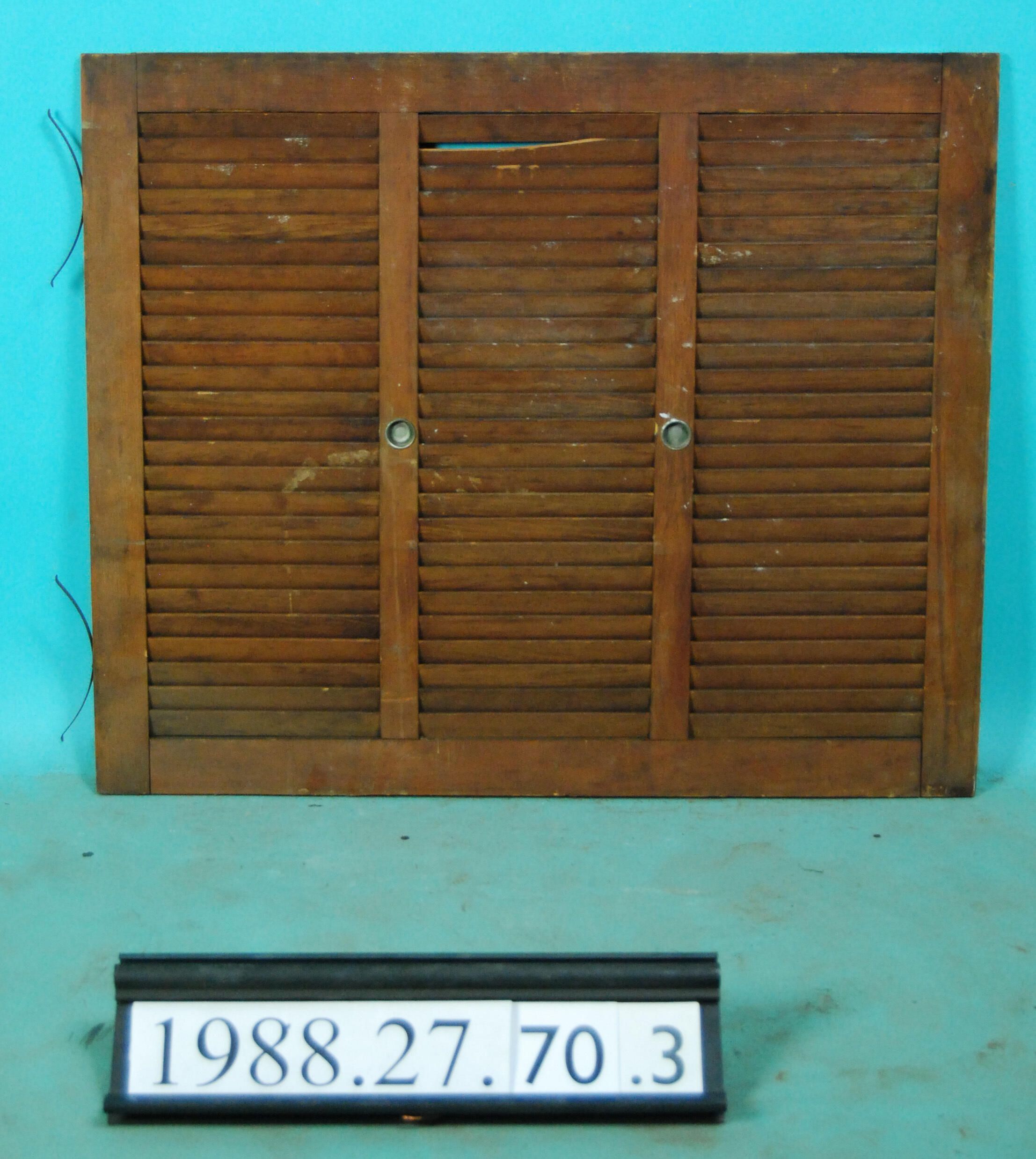 Single interior louvered shutter/blind designed to slide vertically within window frame,varnished. Material: Wood