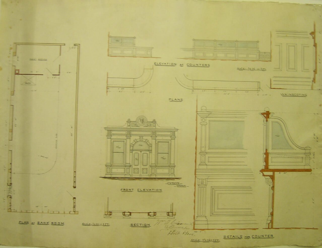 List of Drawings in set: plan of bank room, front elevation, counter plans-elevations-details-section-wainscoting
