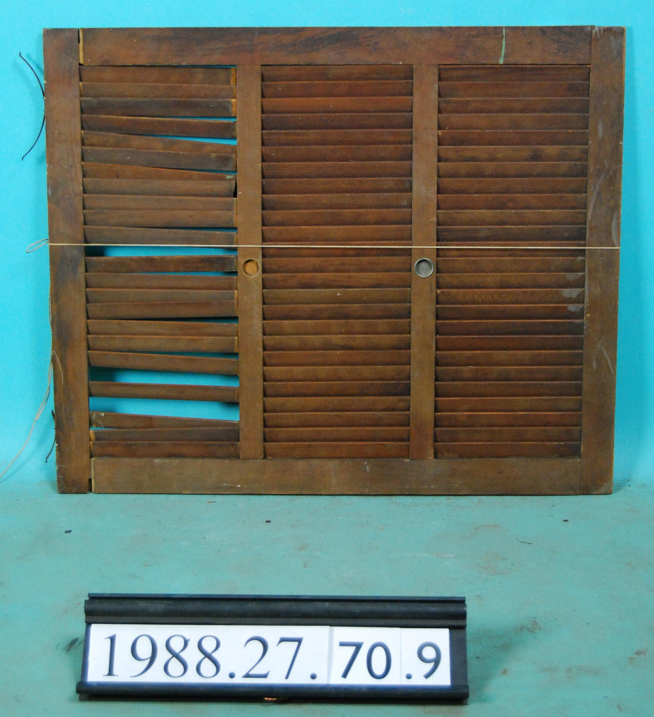 Single interior louvered shutter/blind designed to slide vertically within window frame,varnished. Material: Wood