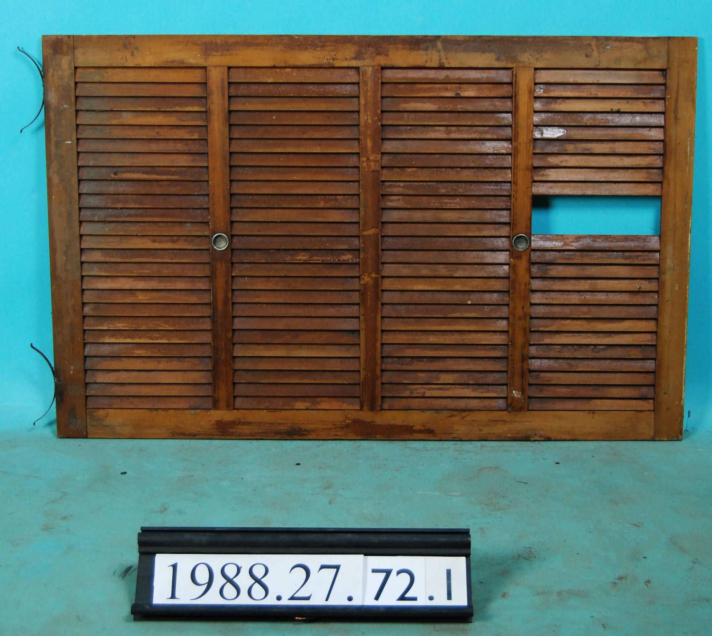 Single interior louvered shutter/blind designed to slide vertically within window frame,varnished. Material: Wood