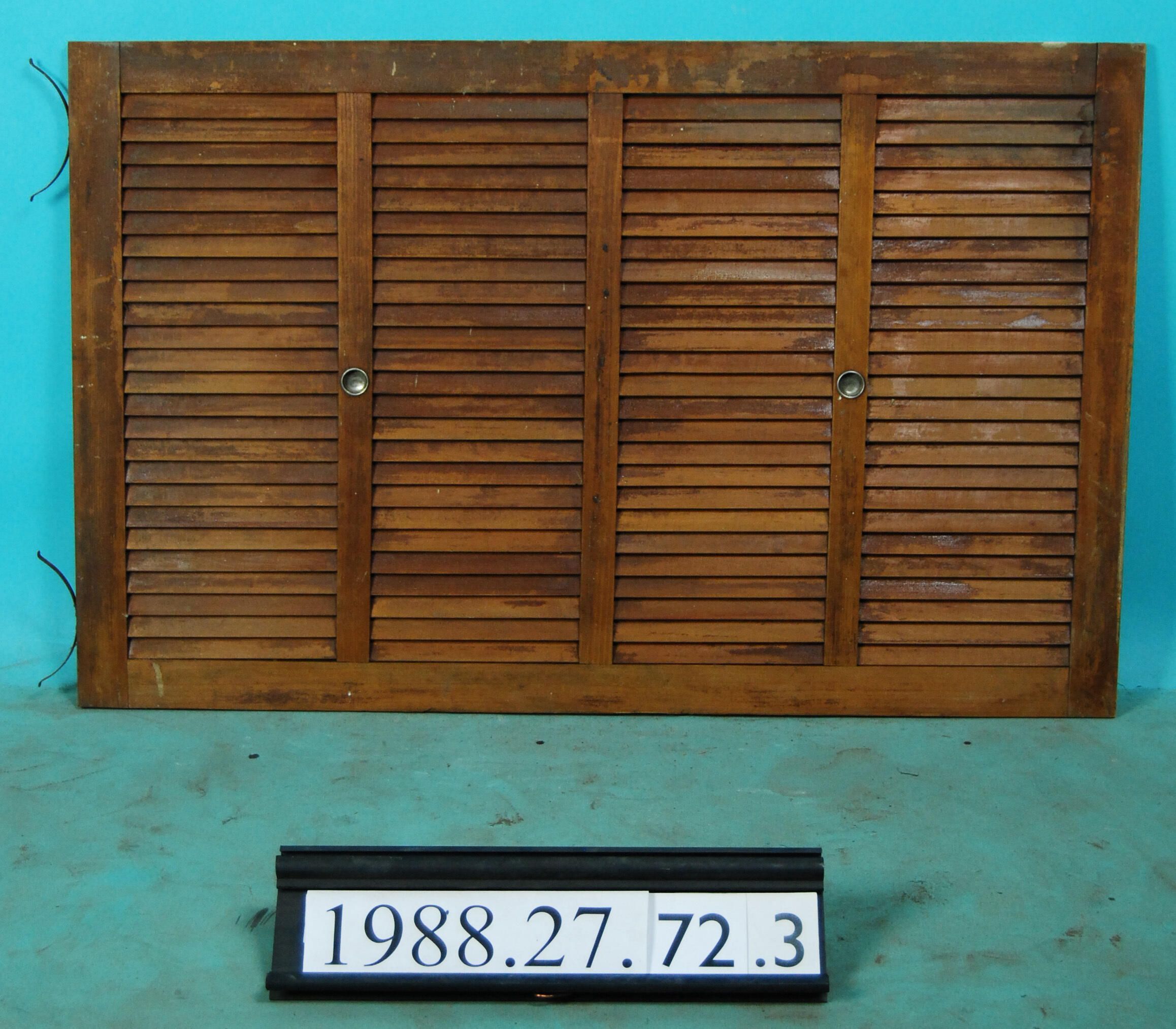 Single interior louvered shutter/blind designed to slide vertically within window frame,varnished. Material: Wood