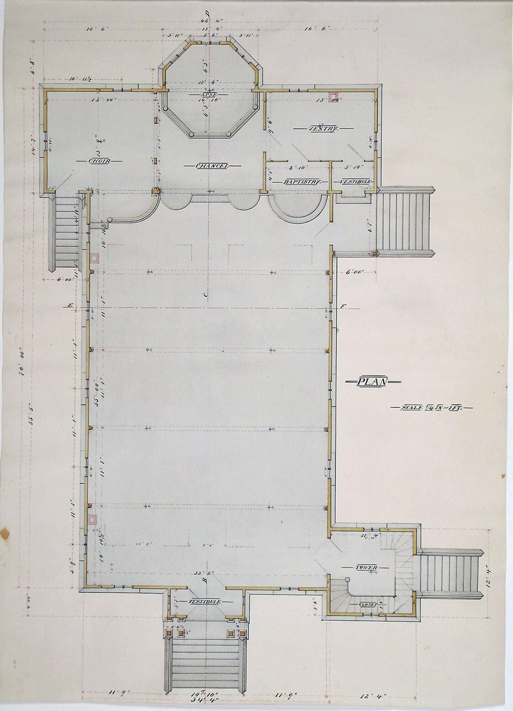 Building Name: Grace Episcopal Church Architect: C.W. Leick Building Location: Astoria, OR Still Existing?: yes Building Description: church List of Drawings in set: plan, ink and watercolor on J. Whatman