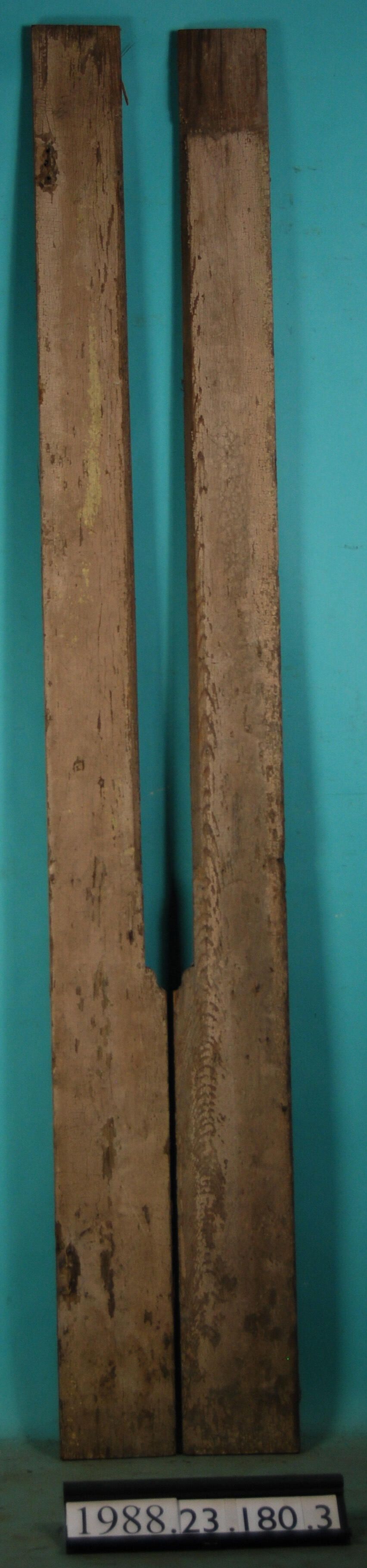 One lot of two exterior wood door or window casings. Each has stop-chamfered edge. Painted beige. Manufacturer: Place of Manufacturer: Design motif: Style: Finish: Painted
