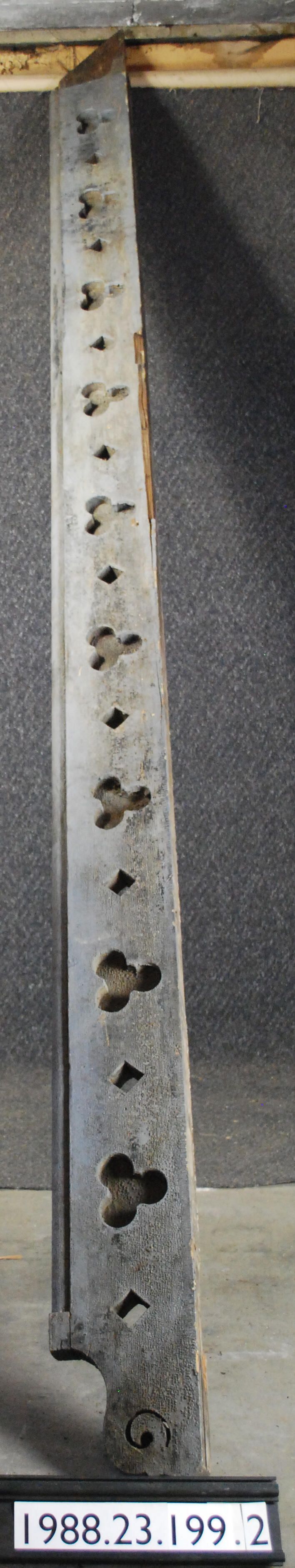 Exterior wood rafter with series of trefoil and diamond shaped cut-out ornaments . Painted grey. Manufacturer: Place of Manufacturer: Design motif: Botanical Style: Finish: Painted