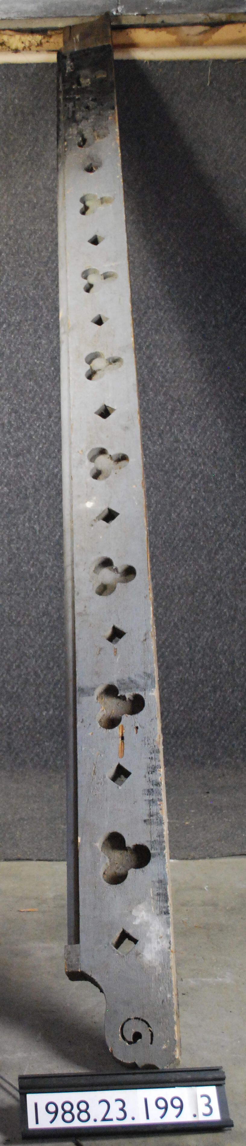 Exterior wood rafter with series of trefoil and diamond shaped cut-out ornaments . Painted grey. One end is charred from fire. Manufacturer: Place of Manufacturer: Design motif: Botanical Style: Finish: Painted