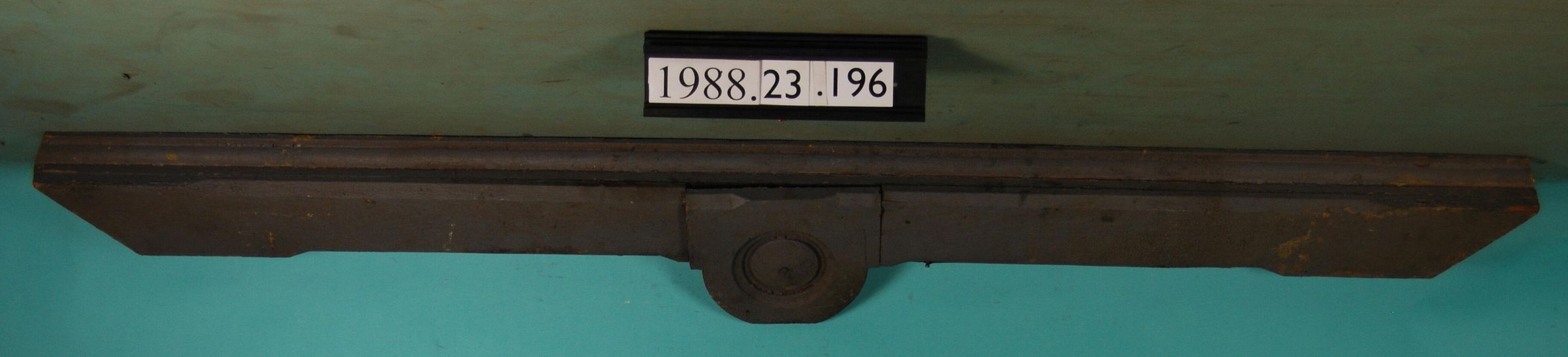 Exterior wood trim built-up with components including beveled boards, molding and bull's eye ornament.Charred on reverse side. painted grey.