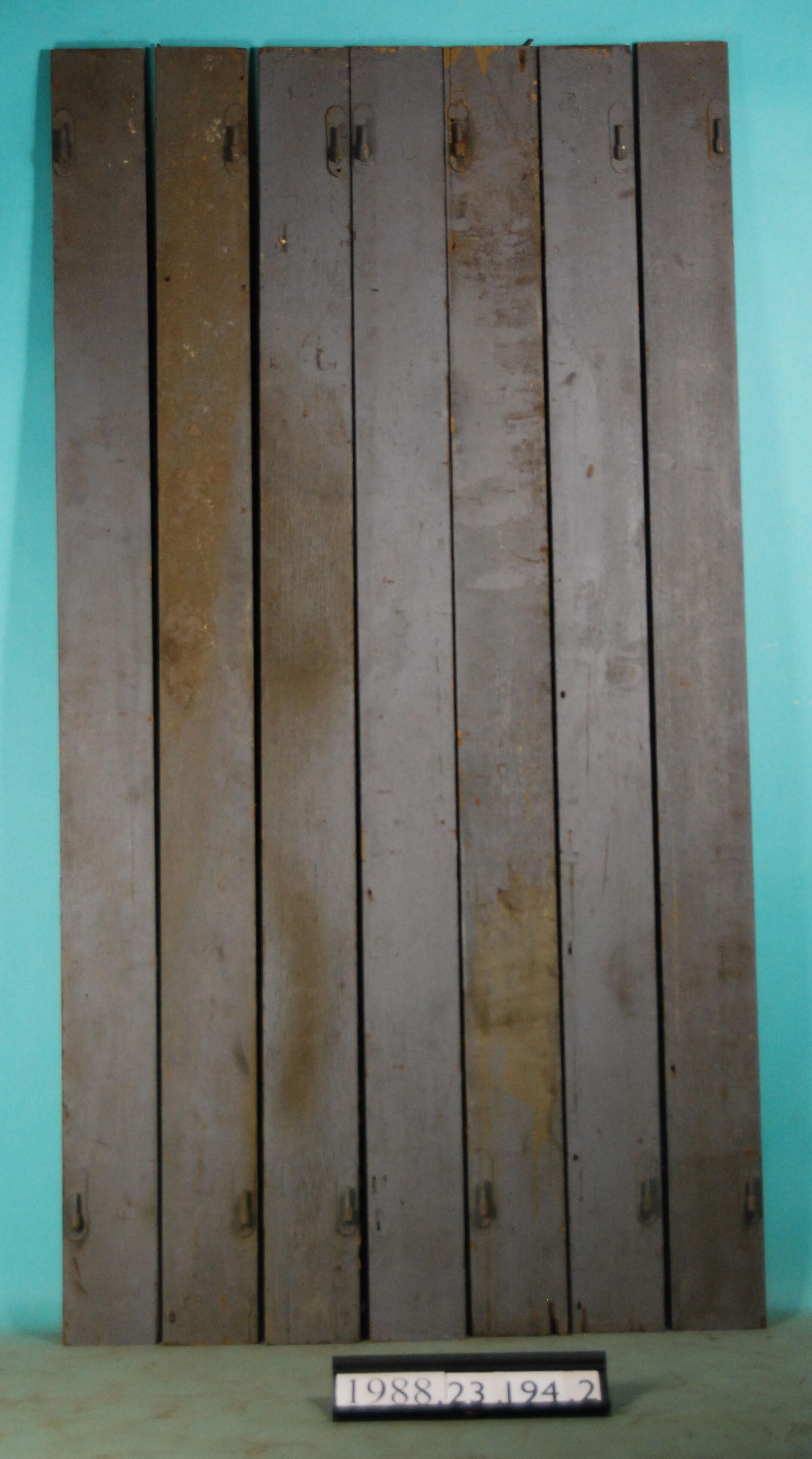 One lot of seven exterior wood window casings,originally each with two surface-mounted iron shutter pintles, one pintle is missing. painted grey.