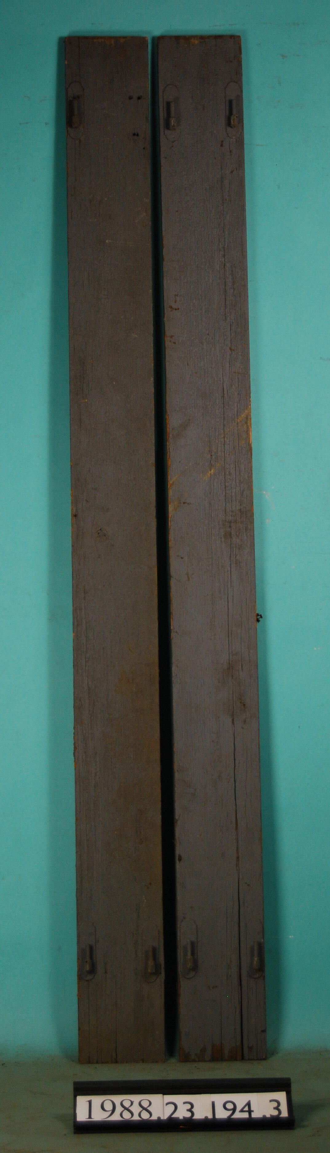 One lot of two exterior wood window casings,originally each with four surface-mounted iron shutter pintles, one pintle is missing. painted grey.