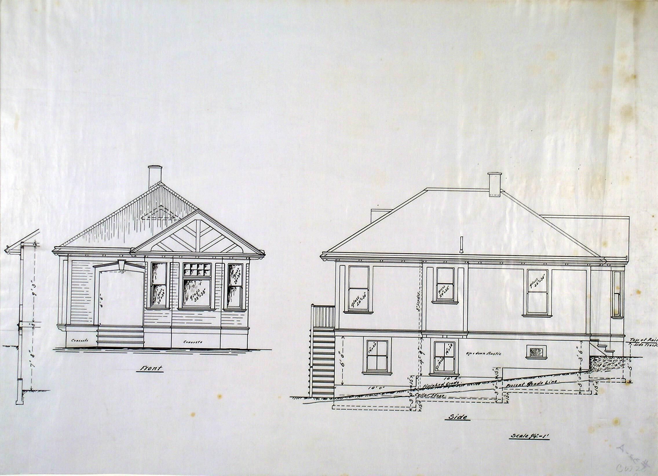 Building Name: unknown residence Architect: est. C.W. Leick Building Location: unknown Still Existing?: unknown Building Description: small victorian house List of Drawings in set: front elevation, side elevation, section