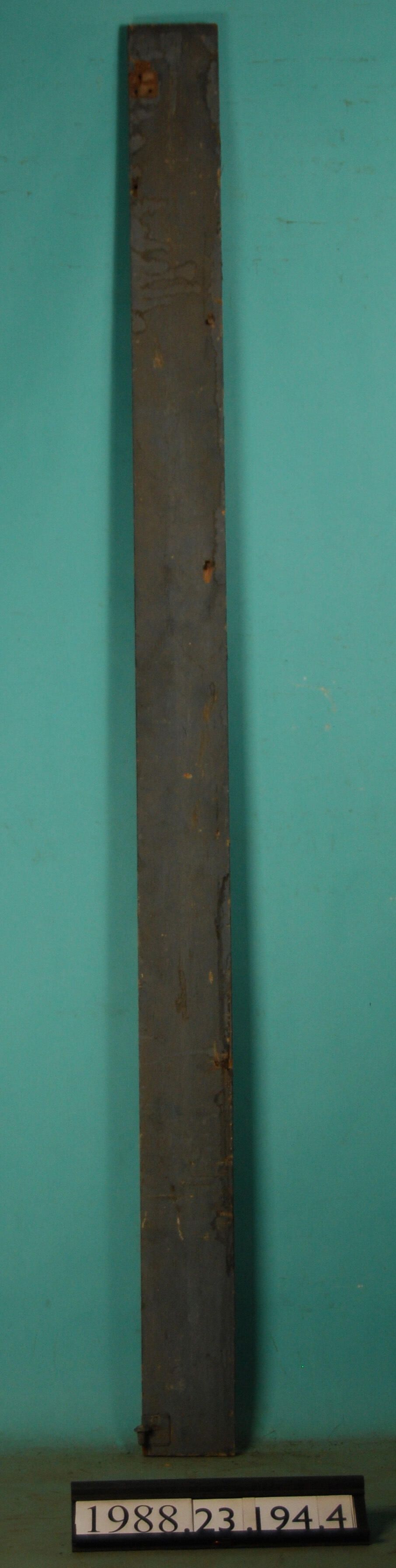 Exterior wood window casing,originally with two surface-mounted iron shutter pintles, one pintle is missing. painted grey.
