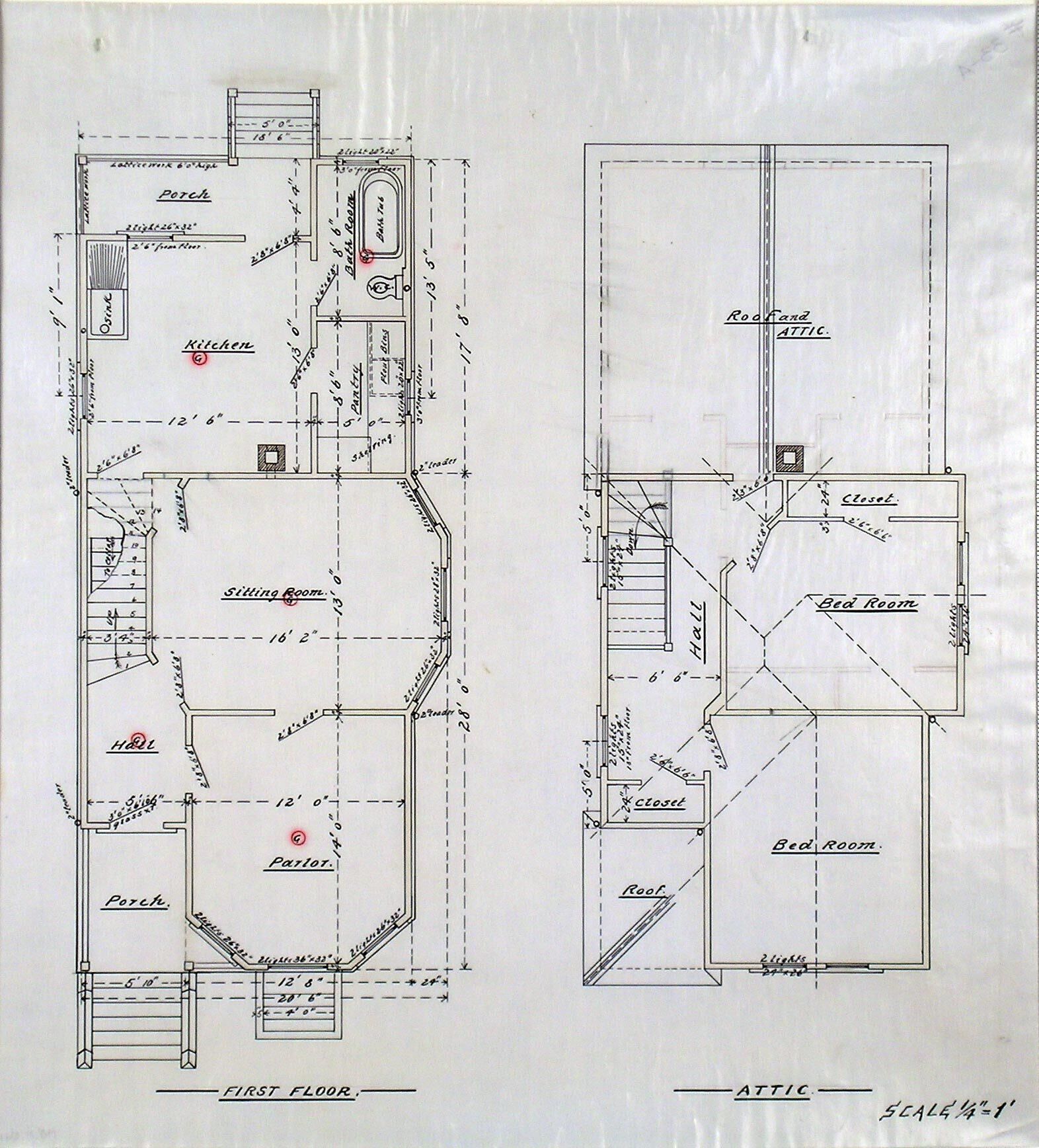 Building Name: unknown residence Architect: est. C.W. Leick Building Location: unknown Still Existing?: unknown Building Description: small victorian residence List of Drawings in set: first floor plan, attic plan - ink on linen