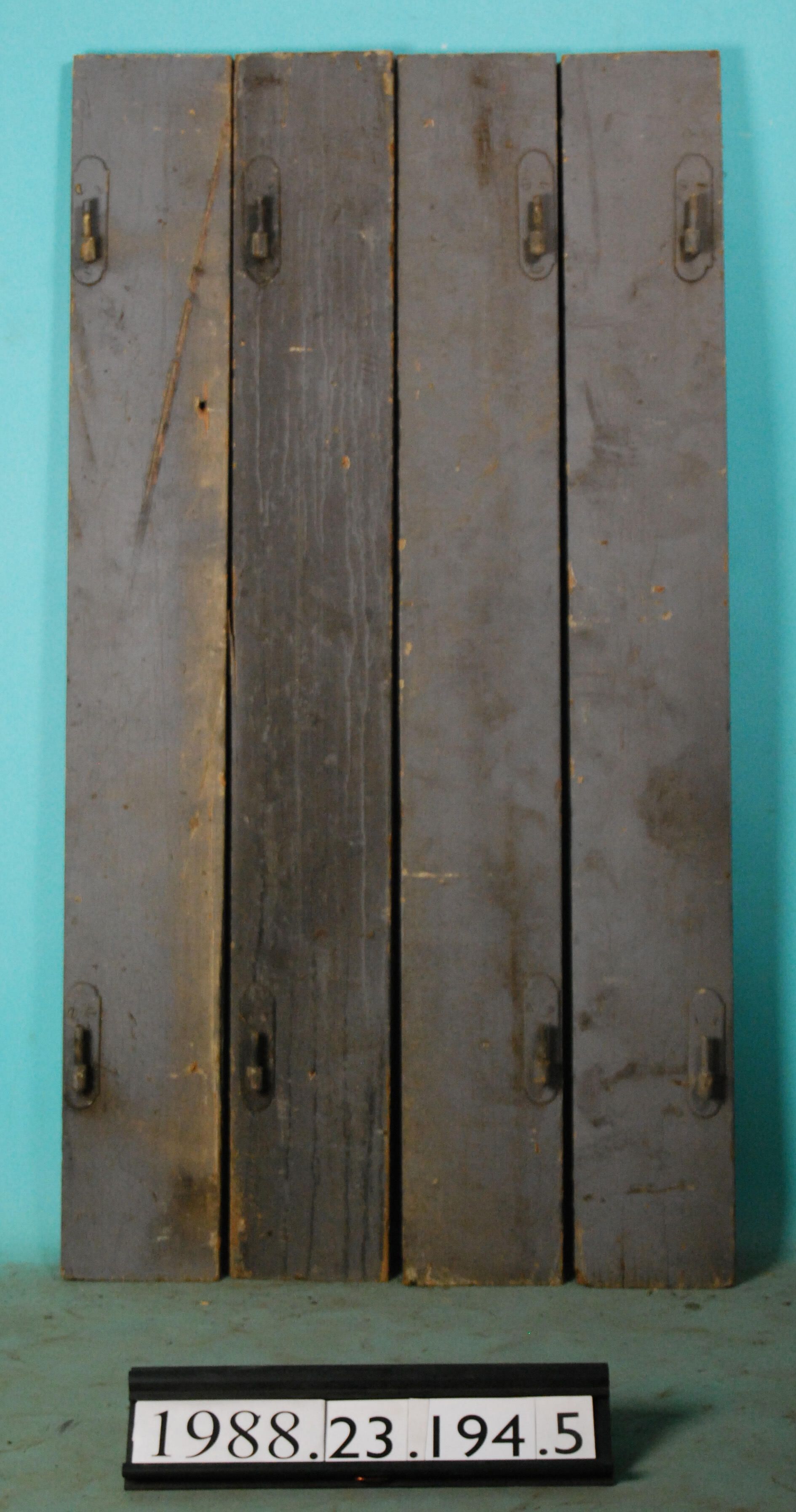 One lot of four exterior wood window casings,each with two surface-mounted iron shutter pintles.painted grey. Manufacturer: Place of Manufacturer: Design motif: Botanical Style: Finish: Painted