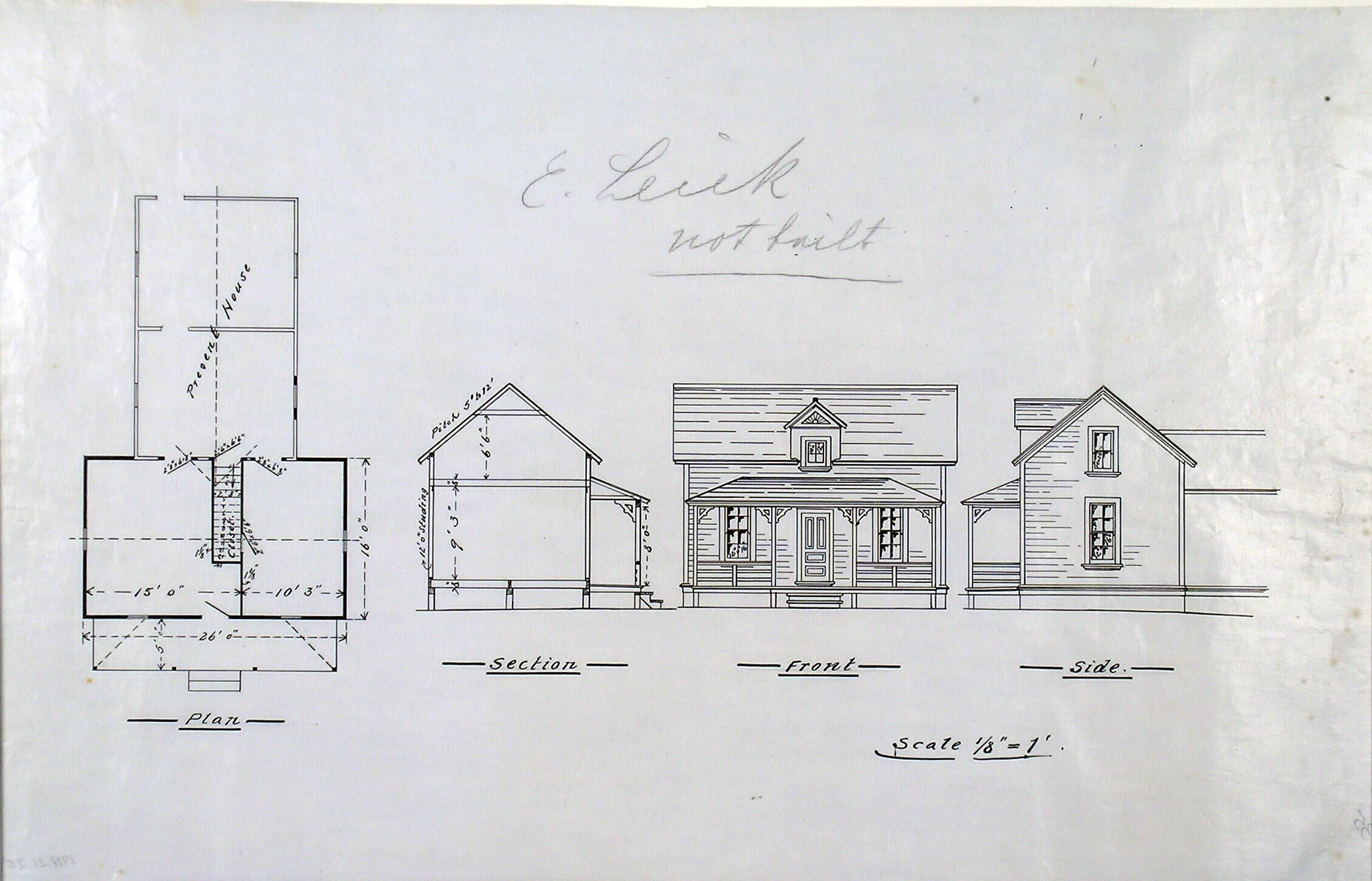Building Name: residence addition Architect: est. C.W. Leick Building Location: unknown Still Existing?: not built Building Description: small victorian residence List of Drawings in set: first floor plan, attic plan - ink on linen