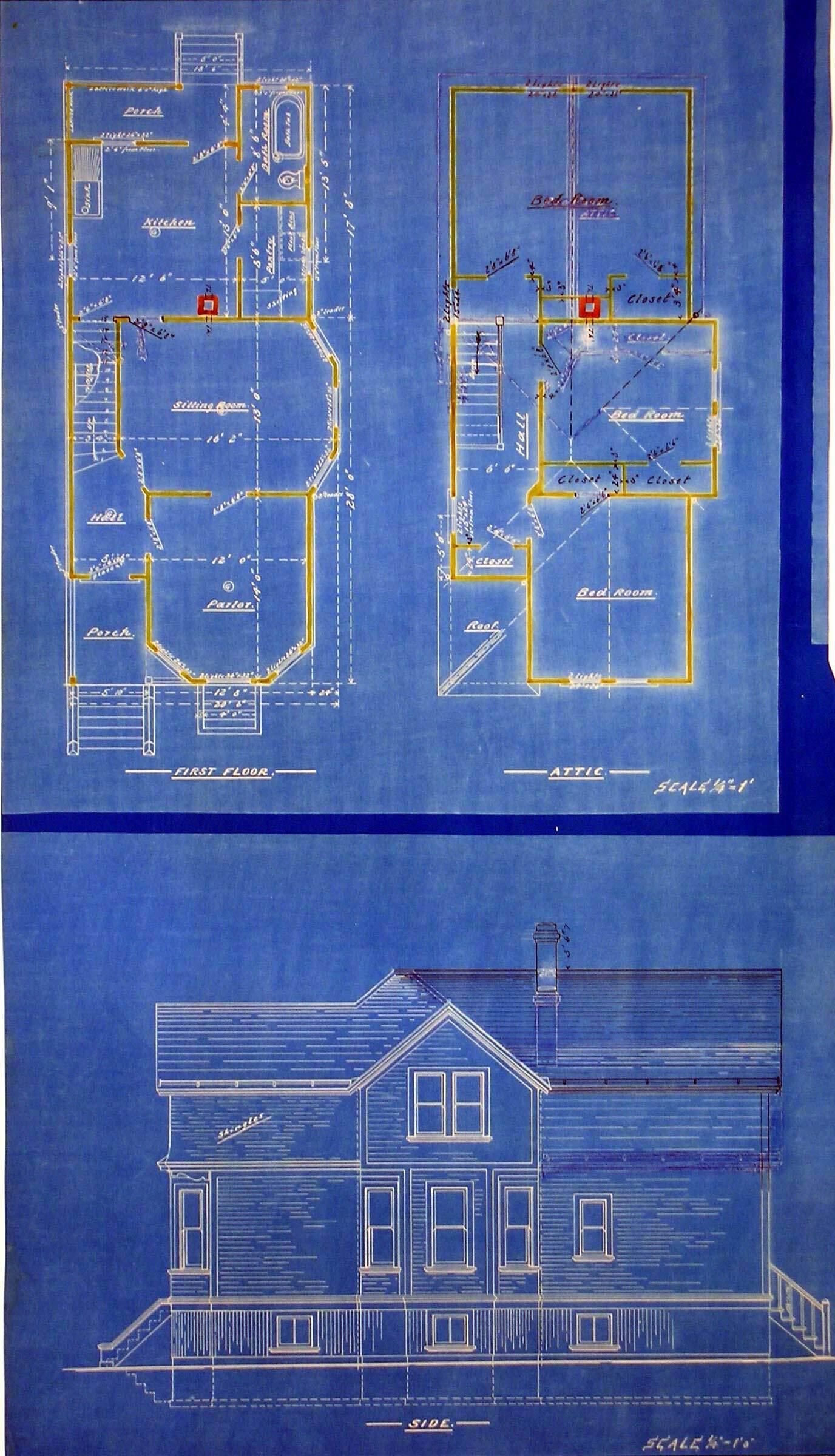 List of Drawings in set: side elevation, first floor plan, attic planLexicon