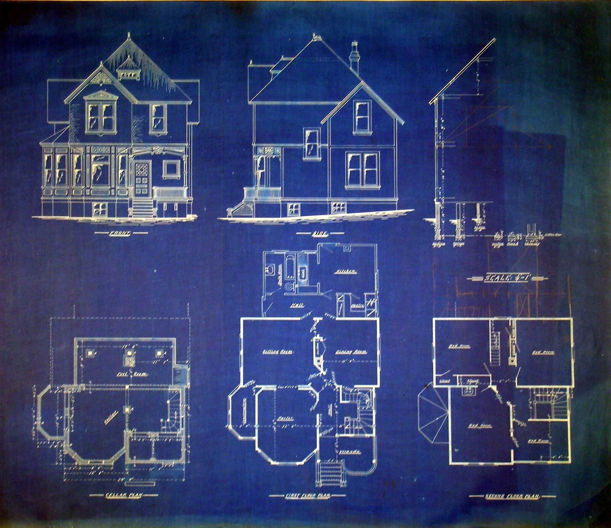 List of Drawings in set: front elevation, side elevation, section, cellar plan, first floor plan, second floor planLexicon