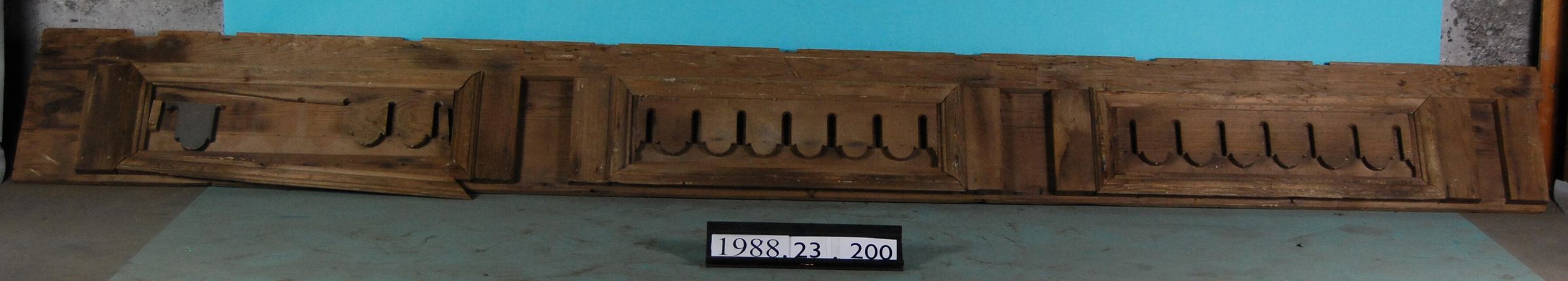 Exterior wood panel with applied moldings, series of fret-sawn ornaments (some missing and one is detached).panel is stripped of paint, detached piece is painted grey .