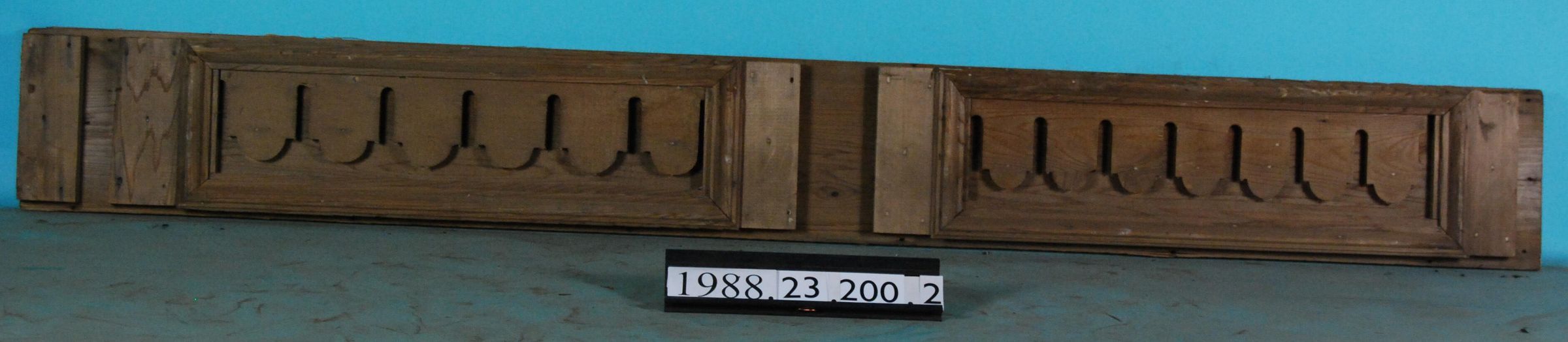 Exterior wood panel with applied moldings, series of fret-sawn ornaments, panel is stripped of paint. Manufacturer: Place of Manufacturer: Design motif: Botanical Style: Finish: Painted