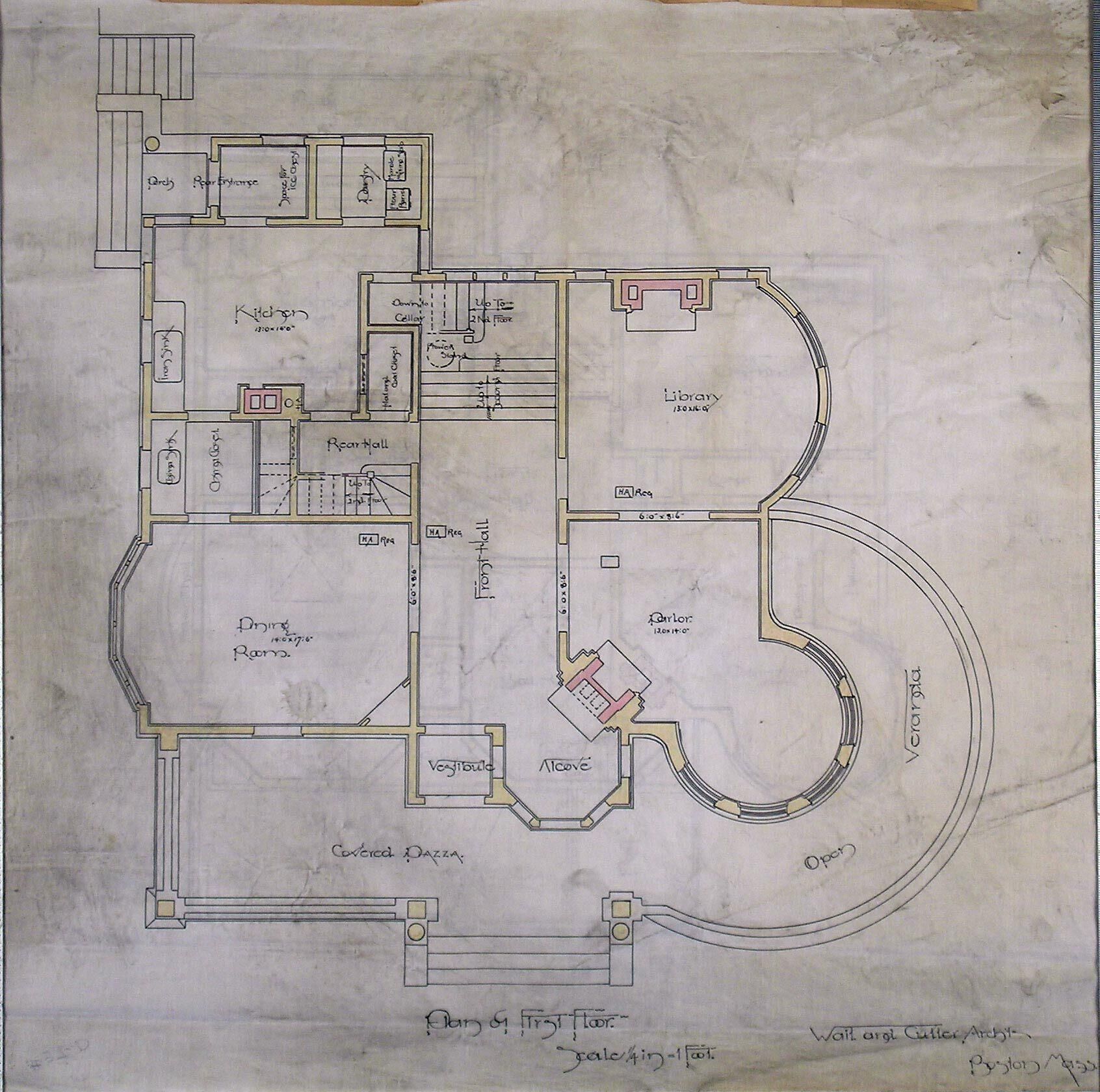 Building Name: Residence Architect: Wait & Cutter Building Location: Boston MA Still Existing?: unknown Building Description: large victorian residence with curved front porch and turret List of Drawings in set: first floor plan