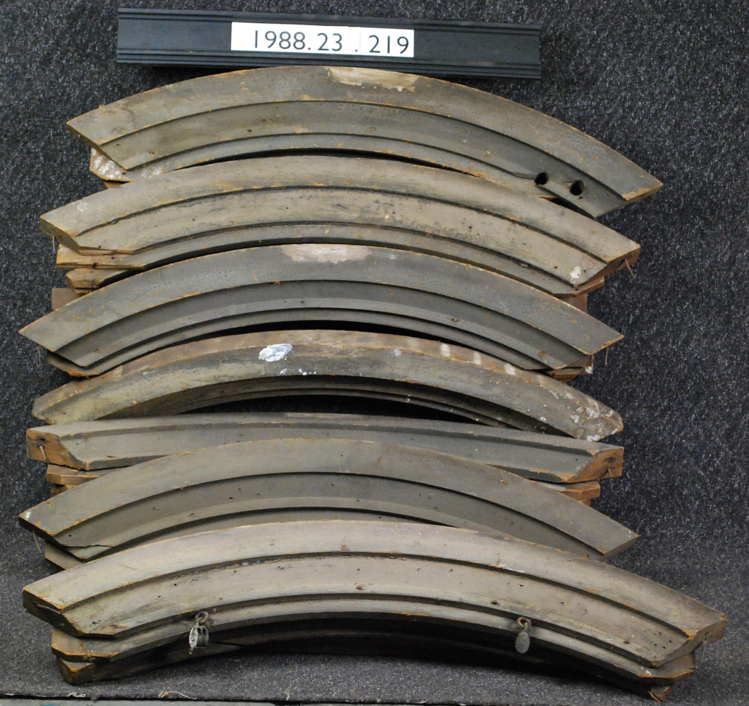 One lot of seven arched exterior wood window casings with attached window frame headers Painted grey. See 1988.23.218 matching vertical casings. Manufacturer: Place of Manufacturer: Design motif: Style: Finish: Painted