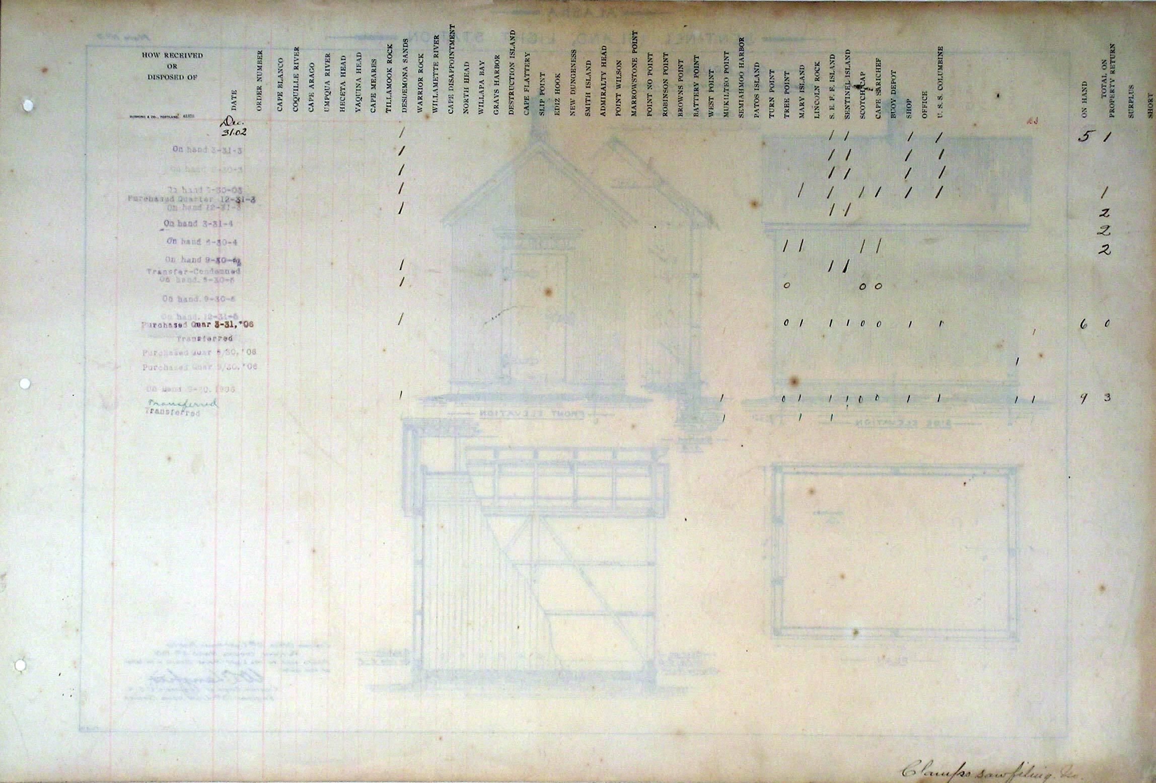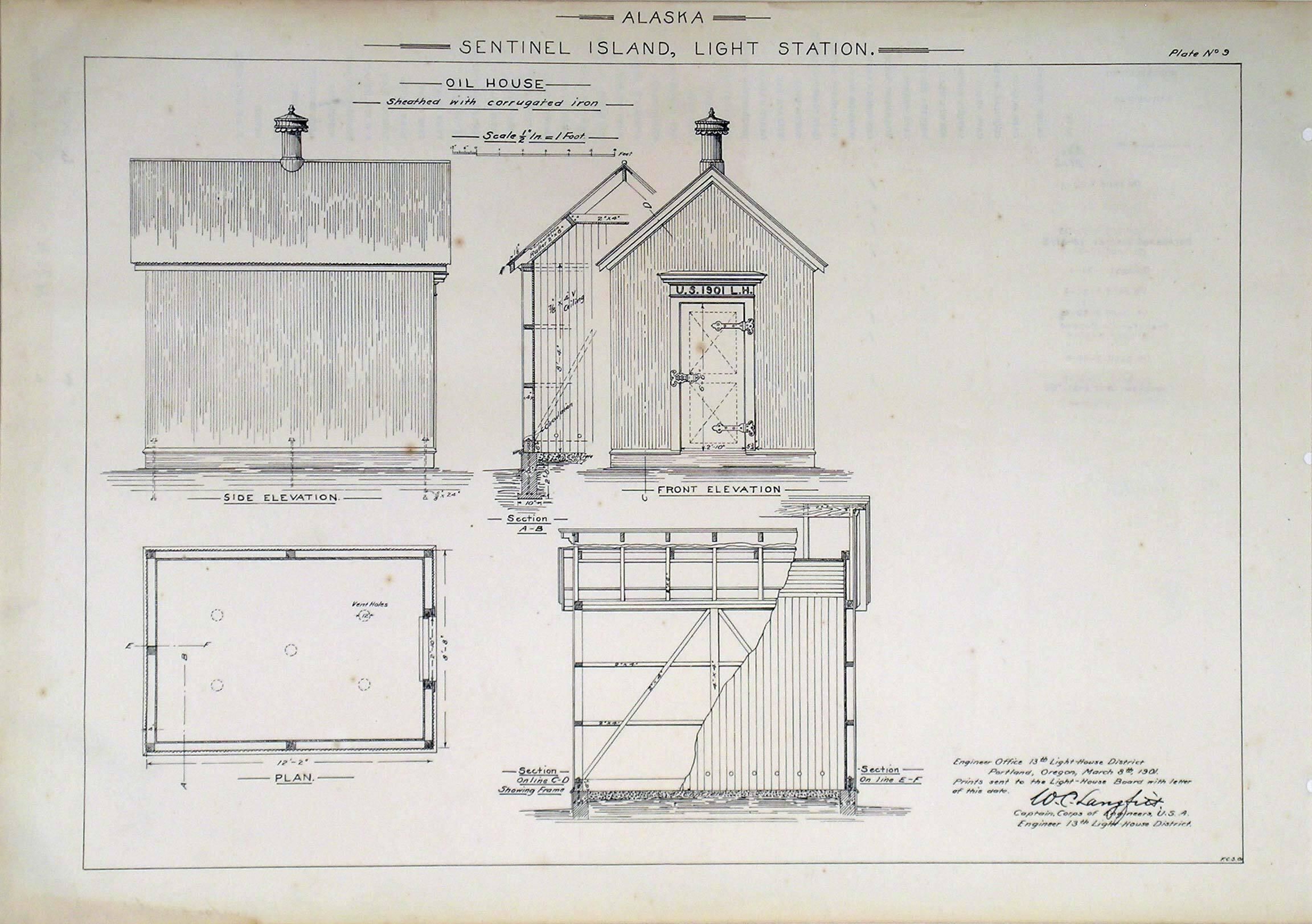Building Name: Sentinel Island Light Station Building Location: Alaska Still Existing?: unknown Building Description: oil house List of Drawings in set: oil house - front elevation, side elevation, plan, section