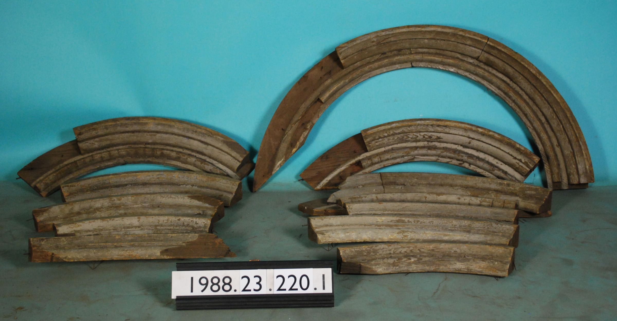 One lot of eleven arched exterior wood window casings and detached curved moldings from same.,compound molding profile and applied moldings,some pieces missing, painted grey