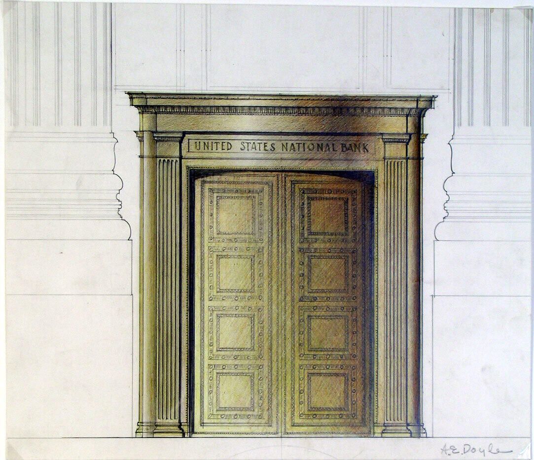 Building Name: Doorway - United States National Bank Architect: A.E. Doyle Building Location: unknown Still Existing?: unknown Building Description: Classical bank building List of Drawings in set: elevation of doorway in color