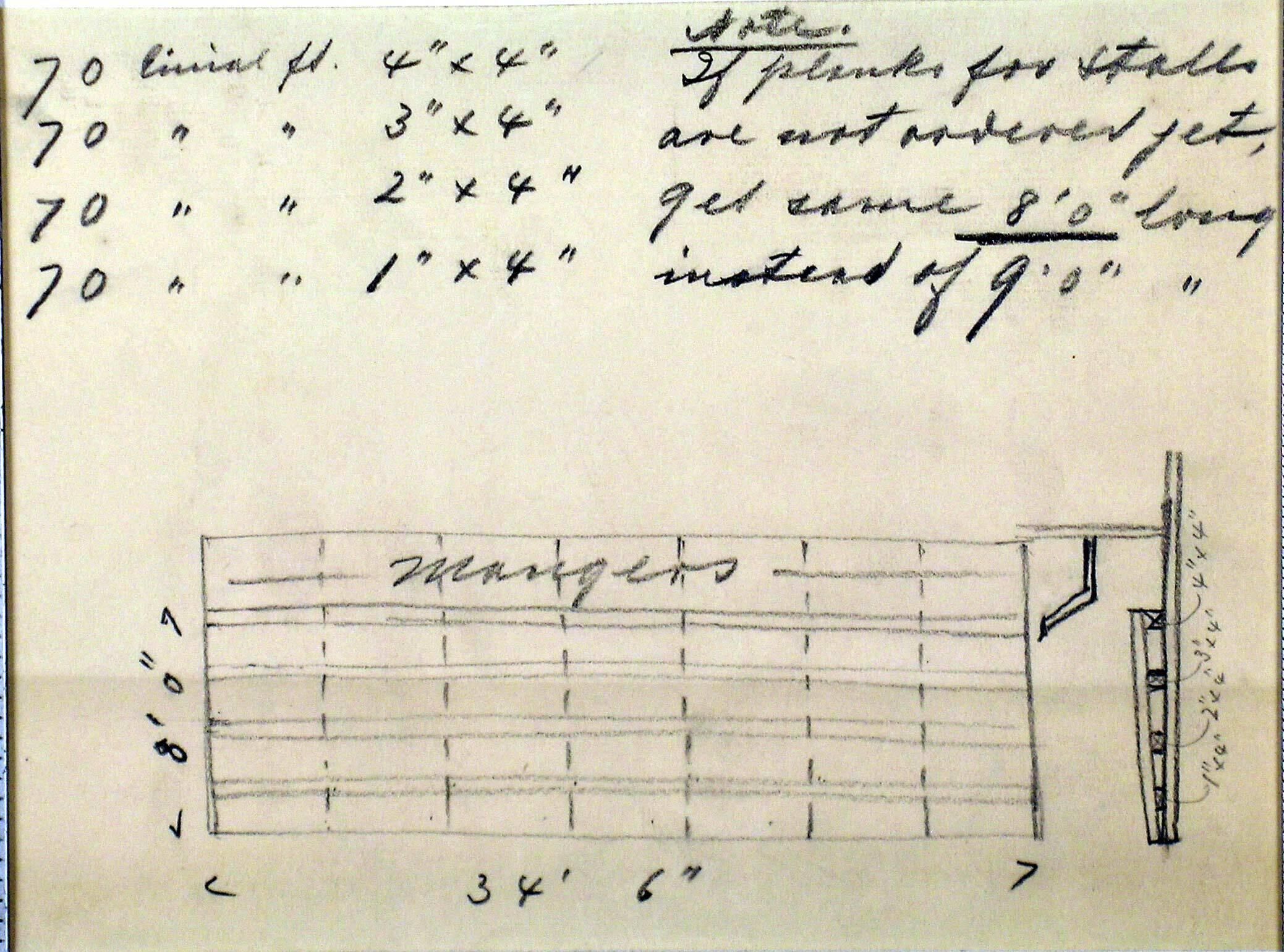 List of Drawings in set: elevation and section of mangers and materials and dimensions for mangers and stalls