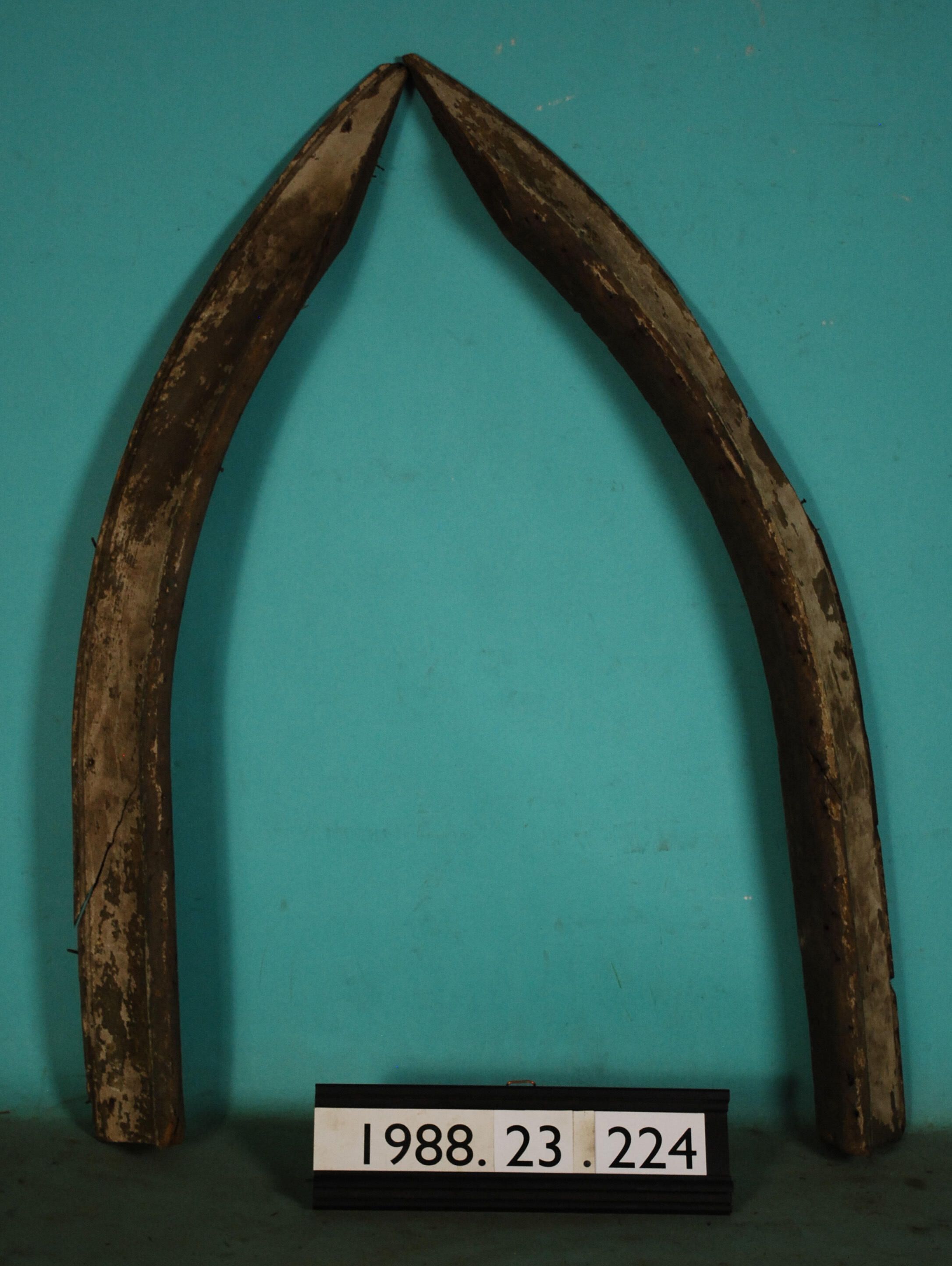One lot of two arched exterior wood moldings probably originally associated with window or door openings, both pieces are truncated at one end, painted off-white.